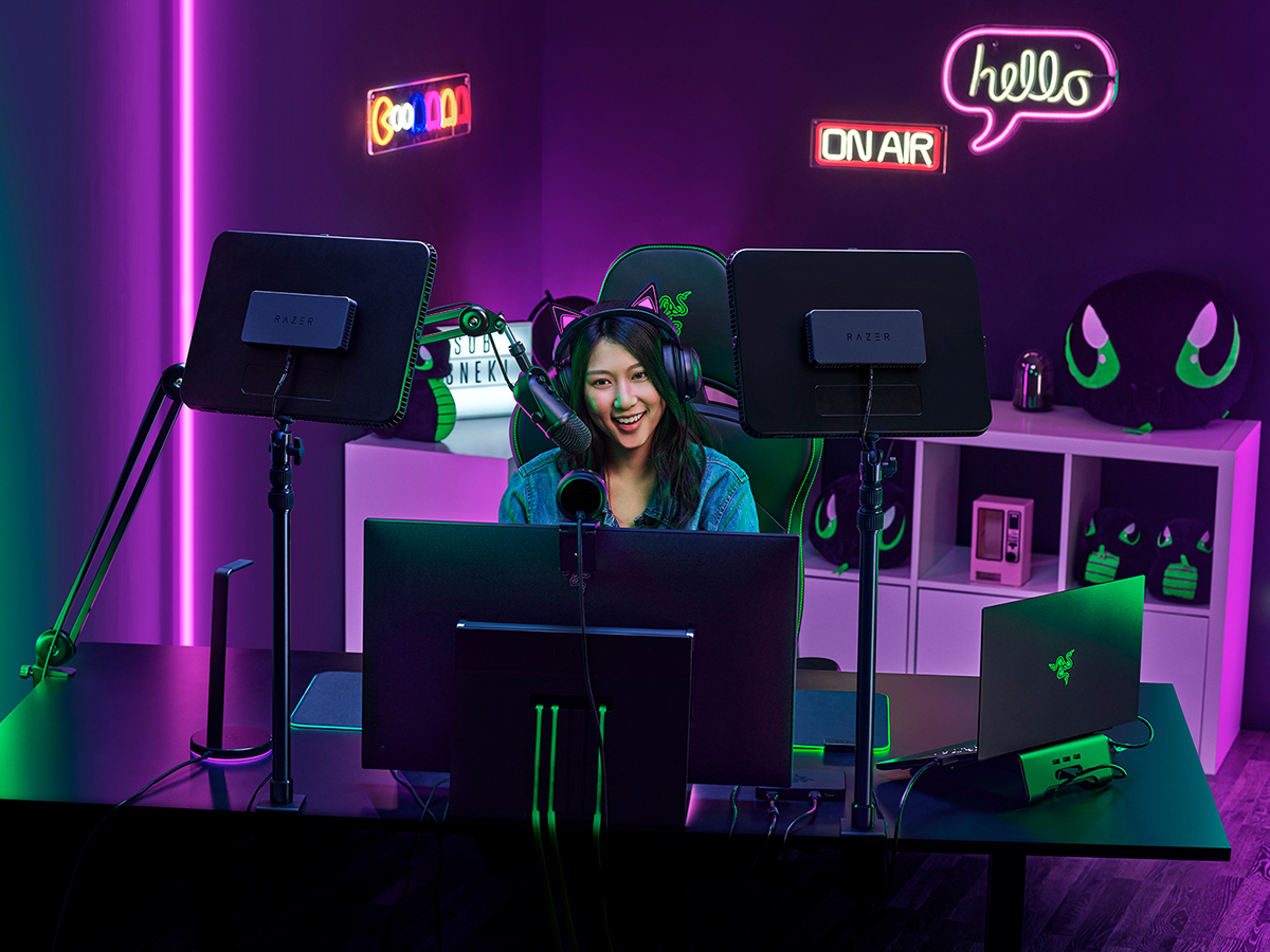 Razer Key Light Chroma è un pannello luminoso pensato per illuminare un soggetto: l’illuminazione è soffusa, quindi non produce il problema della posterizzazione delle alte luci e può essere modulata nel colore che più si addice all’ambiente.