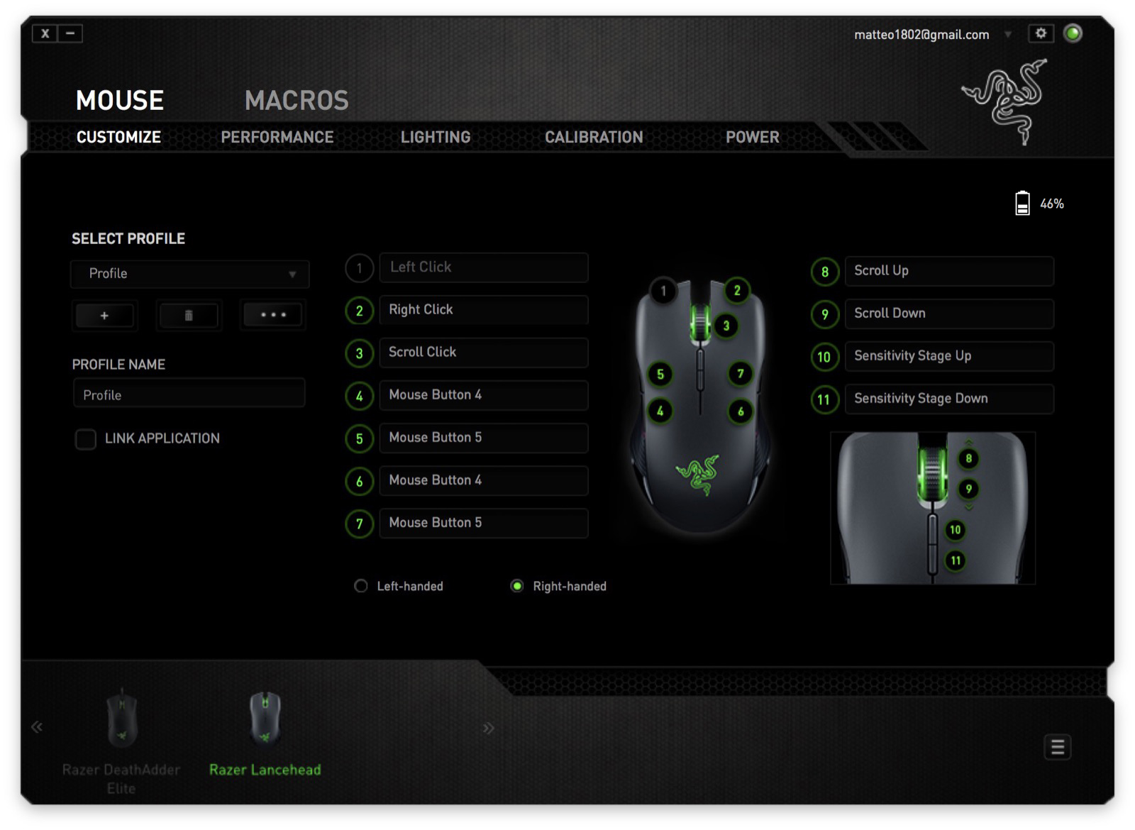 I nove tasti (due frontali più la rotella, due superiori e quattro laterali) sono completamente programmabili dai driver Synapse, attualmente in versione 2 ma nel mentre che scriviamo queste righe Razer sta testando la nuovissima versione 3, a cui questo mouse in particolare si rivolge (e che arriverà come prodotto gratuito a tutti gli utenti): già adesso però i driver Synapse attuali sono compatibili con macOS High Sierra, sui cui è stato realizzato questo test.