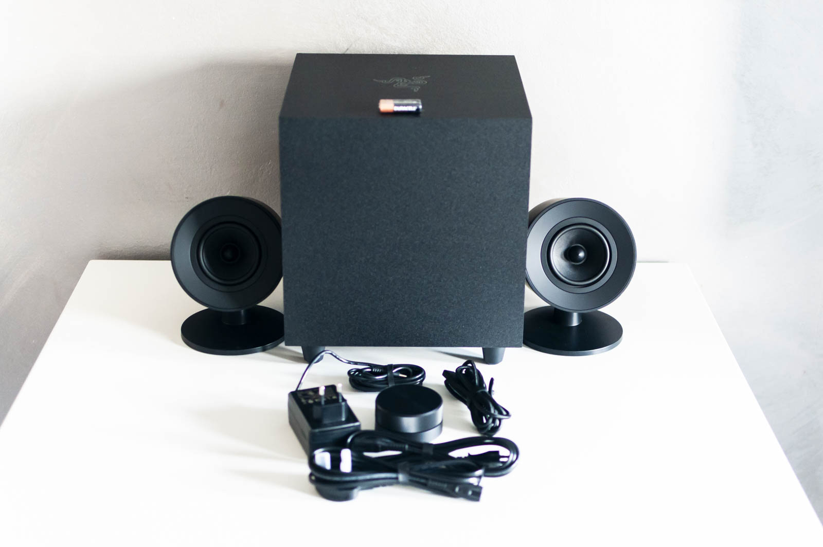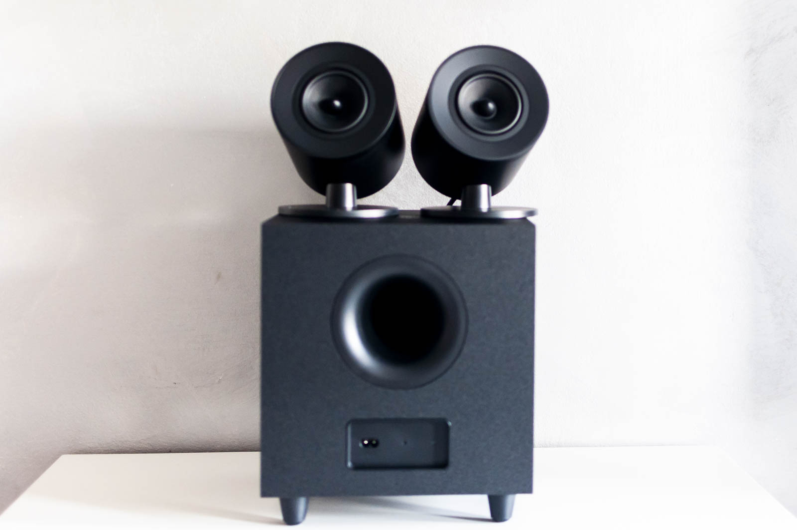 Una volta estratte le varie parti, che si compongono dei due satelliti (dimensioni abbastanza contenute di 130x184x181 mm l’uno) e un Subwoofer cubico (il cui ingombro è di 265x300x265 mm), non resta che posizionare i cavi di collegamento, l’alimentatore (esterno per i satelliti e interno per il Subwoofer) e attivare il tutto.