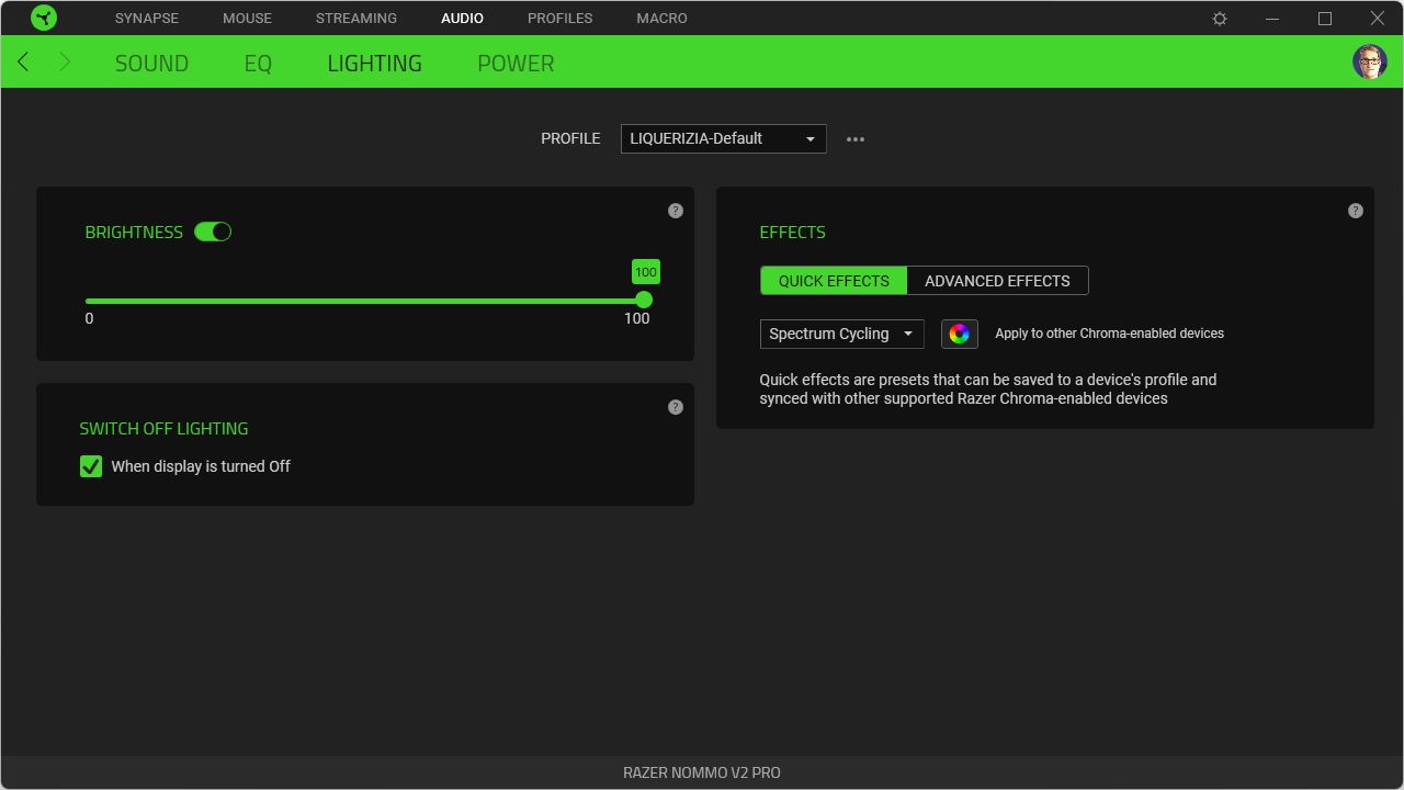 Il punto è che l’illuminazione non solo non si può cambiare, ma neppure togliere: non essendoci una App a supporto (come invece c’era per il modello Razer Nommo Pro) pare non ci sia modo di contenere l’effetto.