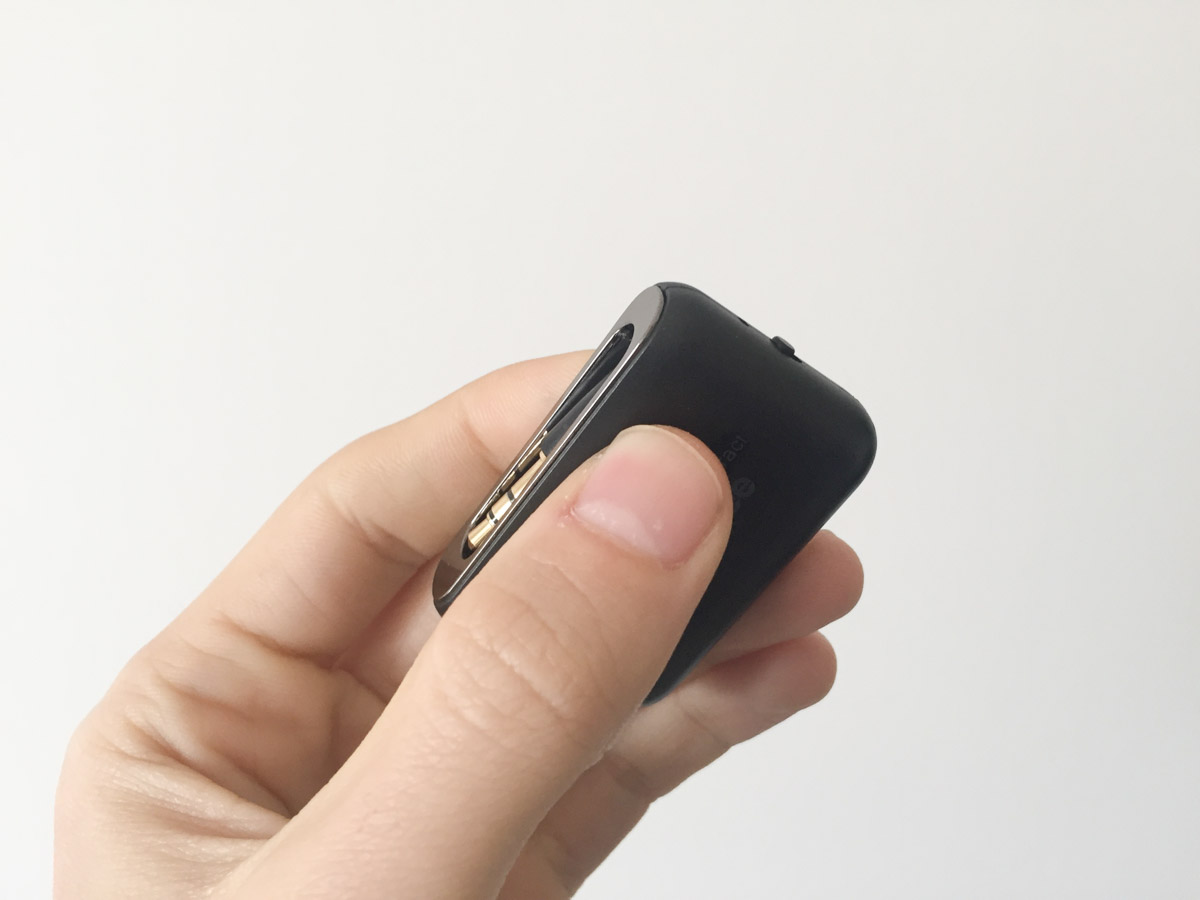 Non agganciandosi fisicamente alla periferica audio, è dotato sul fondo di un sistema a velcro per poter essere attaccato al cruscotto o nella posizione più congeniale al proprio utilizzo. In confezione ci sono due adesivi a velcro per permettere di spostare il ricevitore da un’autovettura all’altra senza doverne acquistare un secondo.