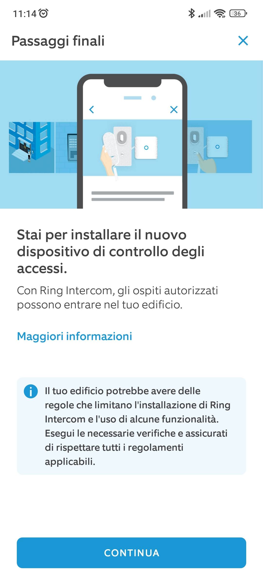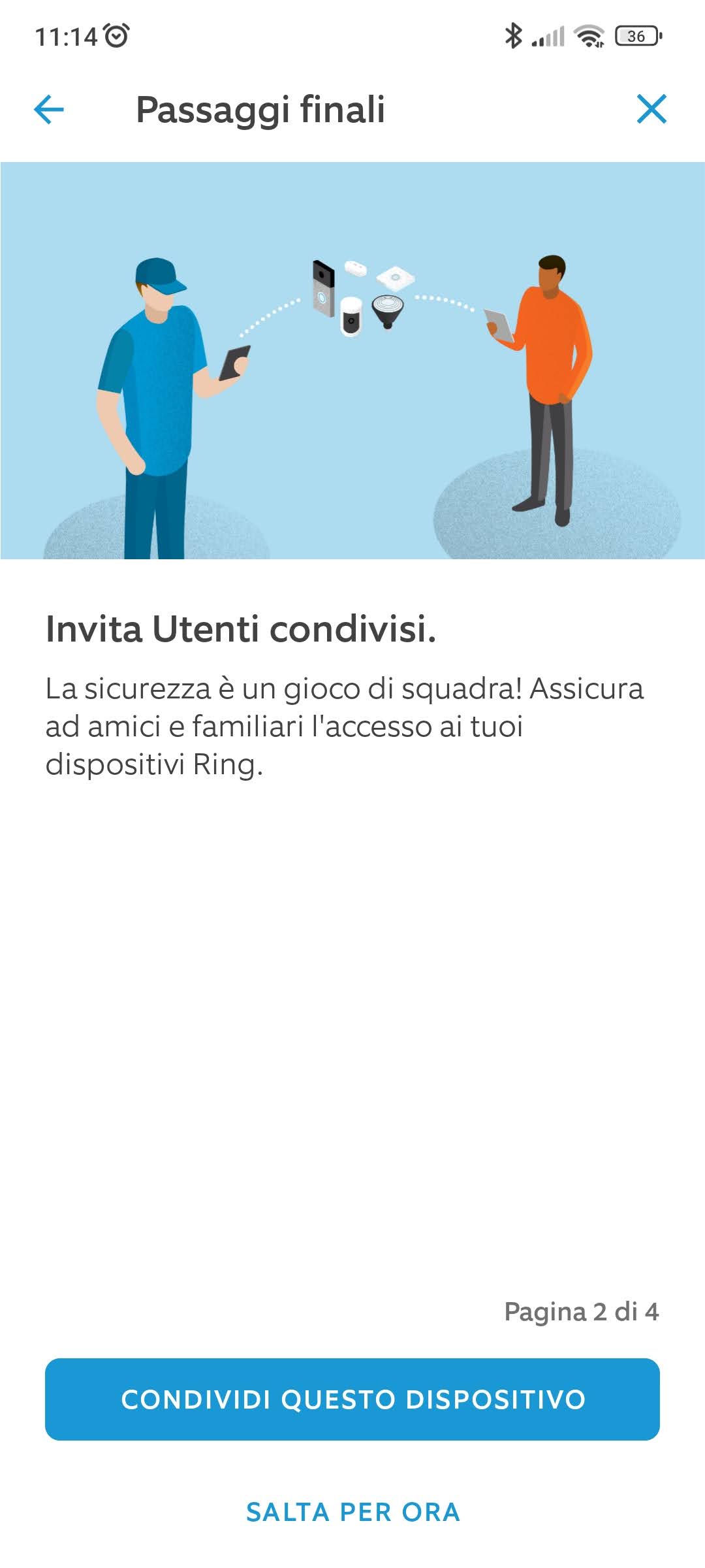 Di seguito vi proponiamo tutte le schermate che guideranno l’utente all’abbinamento del Ring con lo smartphone, nonché alla corretta installazione con il citofono: