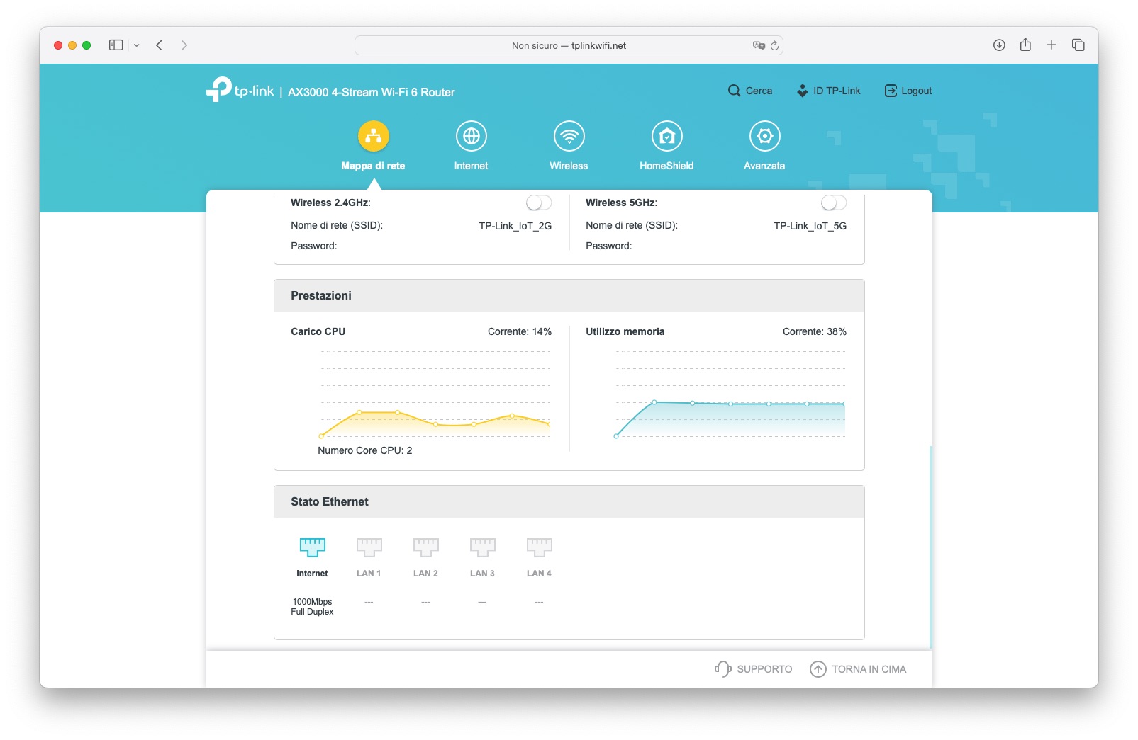 Una delle prime cose che abbiamo impostato è stata la lingua italiana andando su System > Language. Le funzioni avanzate disponibili sono numerose. La mappa di rete consente di visualizzare lo stato di internet; cliccando sul router possiamo ottenere una panoramica con il nome del dispositivo, indirizzi IP, impostazioni wireless (nome di rete e canali 2,4GHz e 5 GHZ), attivare/disattivare la rete ospite, verificare prestazioni e uso memoria, verificare lo stato delle connessioni ethernet.