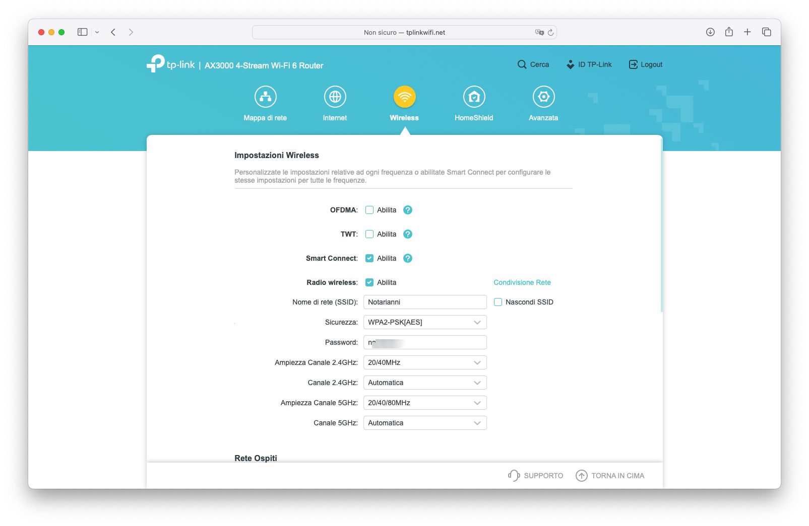 Dalle impostazioni wireless è possibile personalizzate le impostazioni relative ad ogni frequenza o abilitate Smart Connect per configurare le stesse impostazioni per tutte le frequenze; i più esperti possono impostare OFDMA (consentire a più utenti di trasmettere dati contemporaneamente), TWT (consentire a router e client 802.11ax di negoziare i loro periodi per trasmettere e ricevere pacchetti di dati), smart connect (il router può bilanciare le richieste di connettività e assegnare i dispositivi alla frequenza migliore), scegliere il tipo di sicurezza per la rete ospiti (WPA/WPA2, WPA2/WP3, portale (una vera e propria pagina di autenticazione con registrazione).