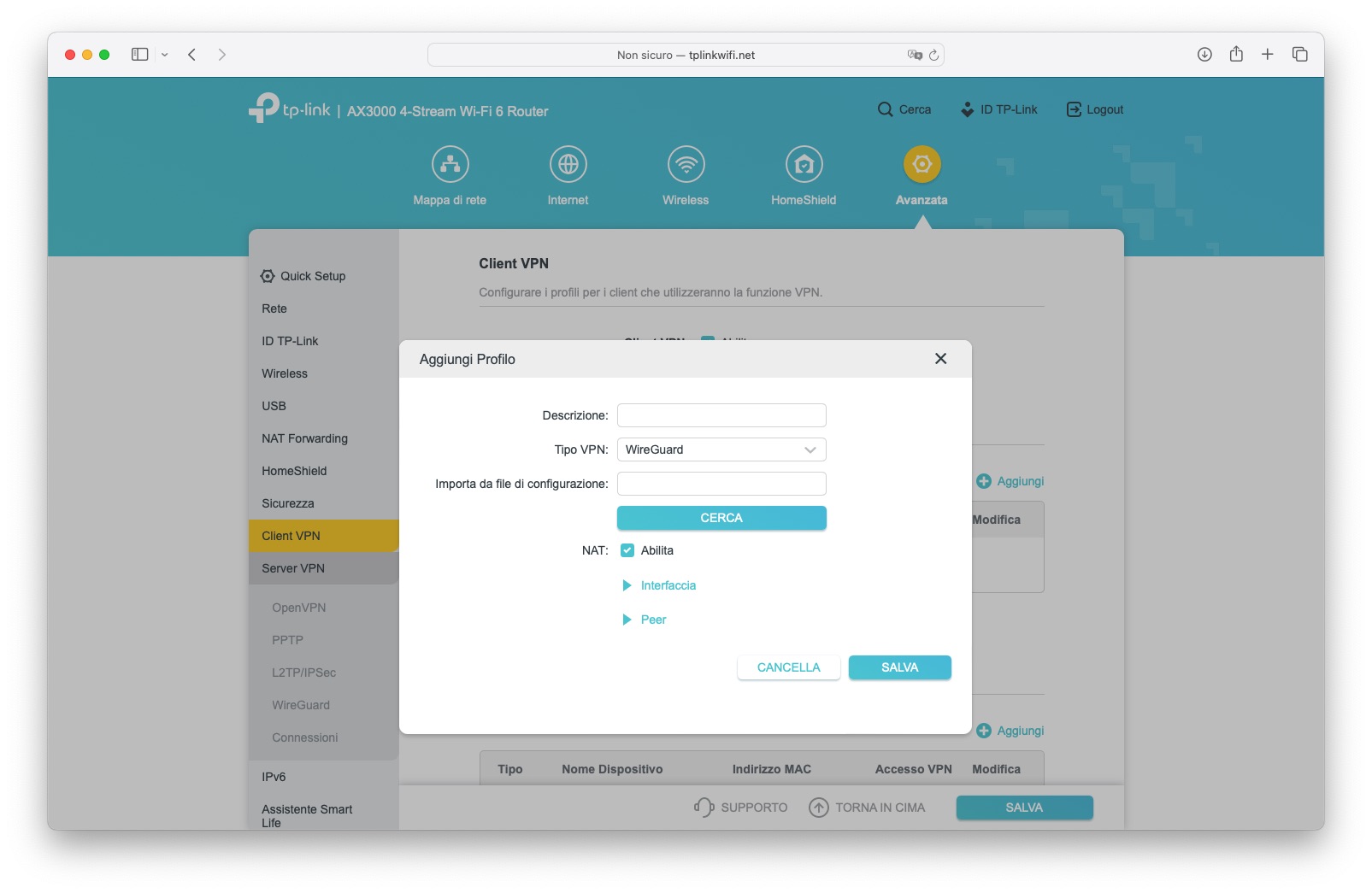 La sezione client VPN permette di configurare i profili per i client che utilizzeranno la funzione VPN, aggiungendo o modificando client e server specifici. Altre opzioni che saranno apprezzate dai più esperti sono quelle relative a PPTP, impostando VPN e account PPTP per un veloce accesso da remoto alla propria rete o configurare una VPN L2TP / IPSec.