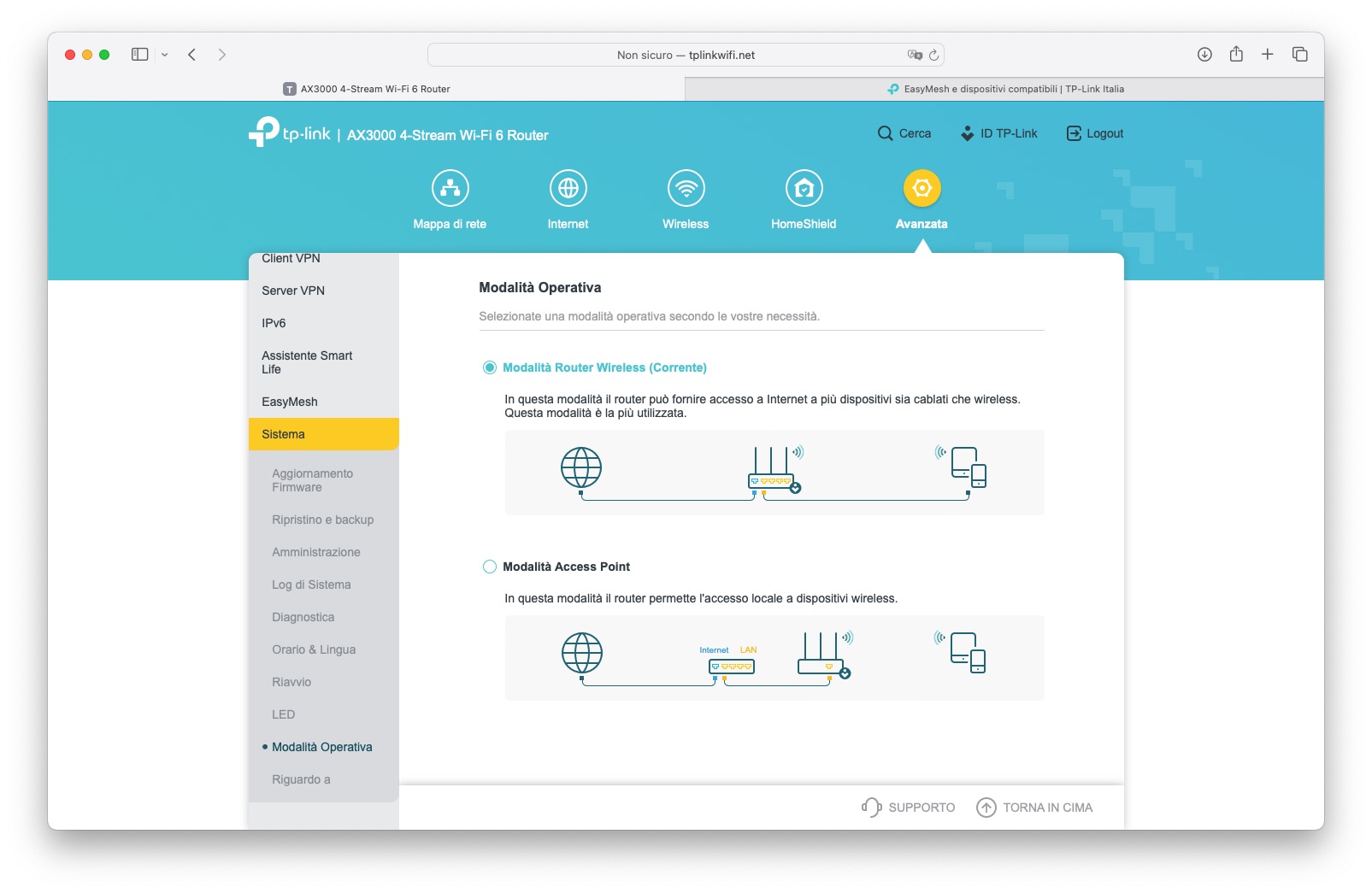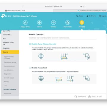 Non mancano opzioni per accendere/spegnere i LED, ripristino/backup delle impostazioni, ripristino (impostazioni di fabbrica), riavvio (programmare orari di riavvio) e per modificare la modalità operativa: come router wireless (il router può fornire accesso a Internet a più dispositivi sia cablati che wireless) e come access point (il router permette l’accesso locale a dispositivi wireless).