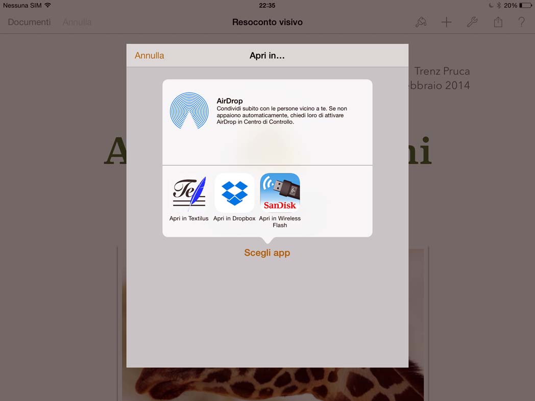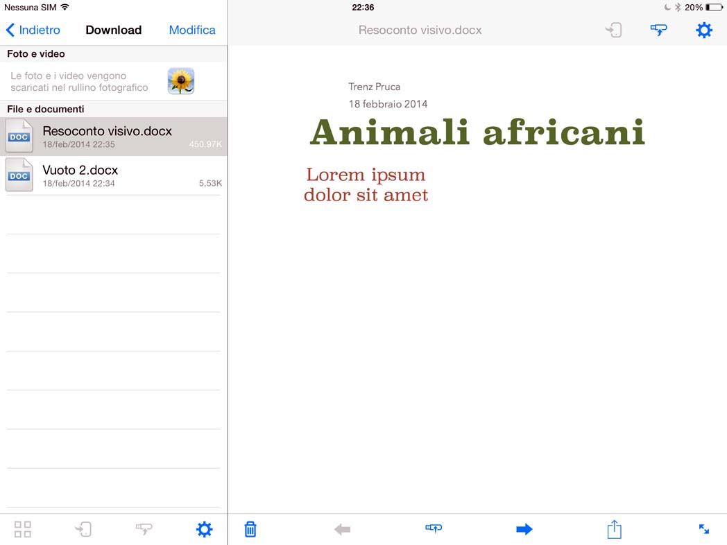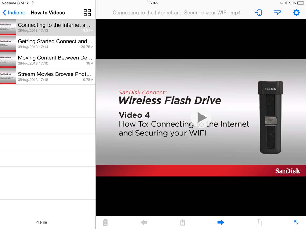 La lettura dei documenti avviene similmente a quella dei filmati, quindi senza necessità di scaricarli dentro al dispositivo. Anche qui sono supportati i formati supportati dal sistema operativo e la gestione avviene concordemente a quanto previsto da esso; ad esempio alcuni documenti in iOS sono aperti direttamente dall’app SanDisk, altri, come ad esempio i documenti di Pages, devono essere mandati ad una applicazione compatibile