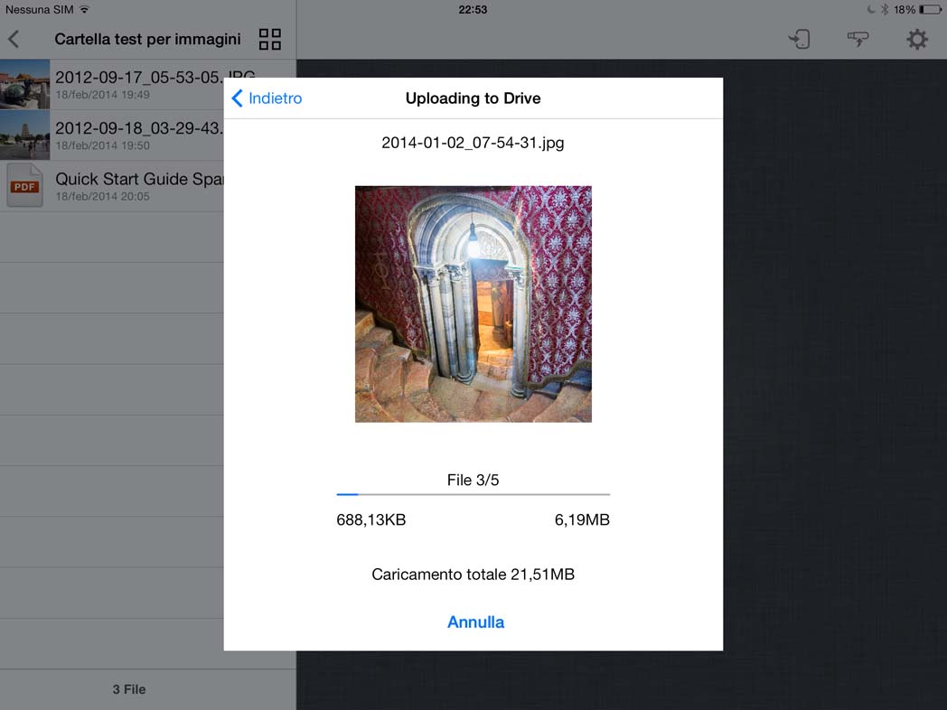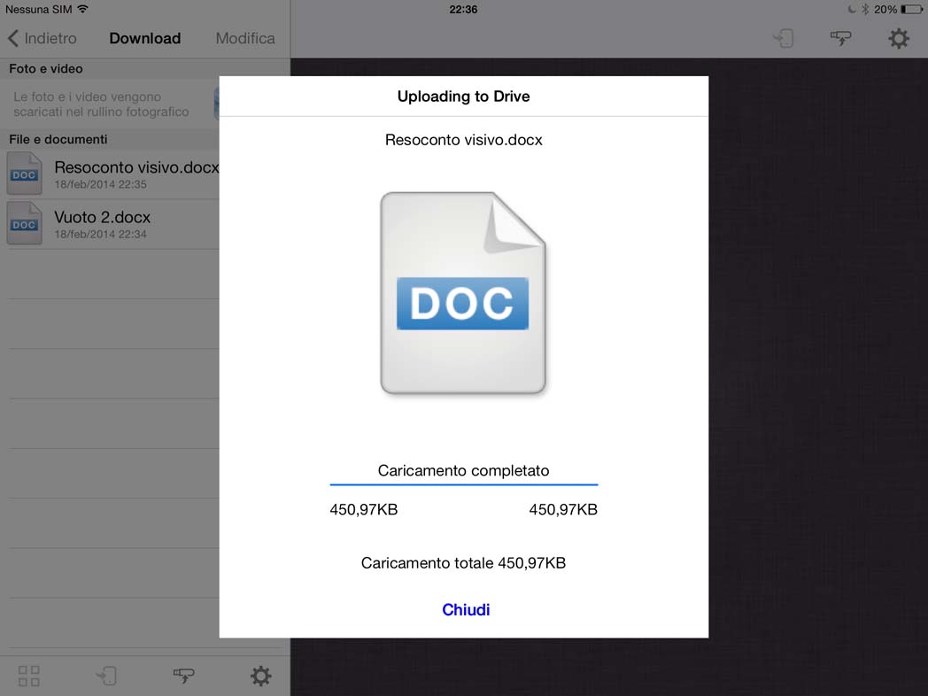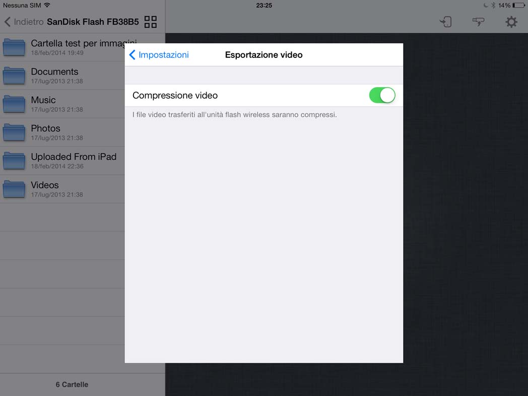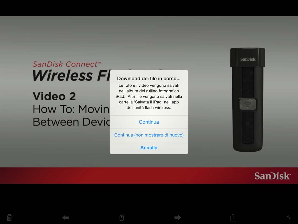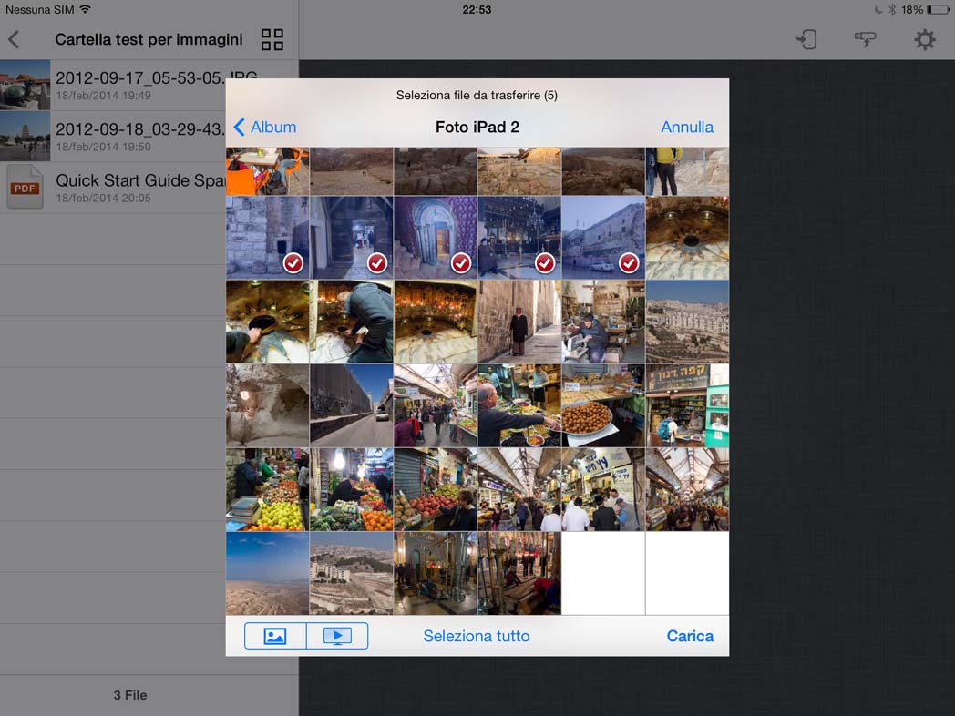 Anche qui il sistema è abbastanza semplice: dovremo sostanzialmente selezionare la cartella del drive in cui collocare il documento, poi dire all’applicazione di caricare un file e ci verranno mostrati quelli disponibili. L’applicazione è in grado di caricare i documenti collocati in una cartella che si chiama “Salvata in iPhone” (o download se stiamo usando iPad) e dal rullino fotografico. La cartella “Salvata in iPhone” è l’unica accessibile al Connect Drive e quindi è qui che finiranno i documenti che andremo a creare con altre applicazioni. Nel nostro test, ad esempio, abbiamo creato un documento con Pages, l’abbiamo salvato in formato Word e successivamente l’abbiamo trasferito dentro alla chiavetta usando l’applicazione SanDisk. Da qui abbiamo potuto trasferirlo nel Mac. L’operazione potrebbe essere più semplice se avessimo usato iTunes oppure iCloud, ma usando il SanDisk Connect Wireless Flash Drive possiamo portare il documento ovunque, anche in PC senza iTunes. Il trasferimento dal rullino è anche più intuitivo: basta selezionare l’opzione e ci verranno proposte le immagini o i filmati che troviamo nel rullino da selezionare e da trasferire.