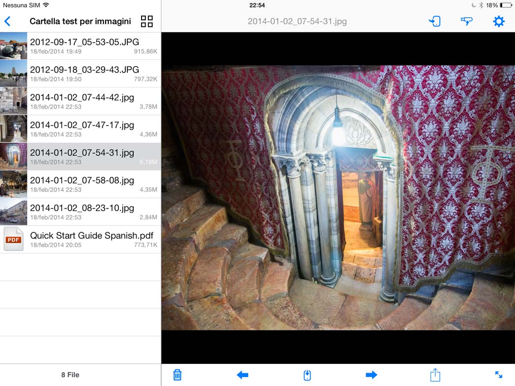 L’accesso alle foto è altrettanto comodo. Anche qui una volta che avremo caricato foto in formato compatibile con il nostro dispositivo, vedremo le anteprime e potremo accedere ad esse, scorrendo da una all’altra; unico limite è che sarà necessario attendere il download di ciascuna immagine. In pratica le foto che saranno state caricate nella cartella, dovranno essere trasferite individualmente e questo significa che passando da una all’altra si dovrà attendere il tempo che la nuova foto sia caricata. Nel caso le immagini siano particolarmente pesanti questo potrebbe prendere qualche secondo.