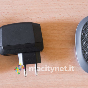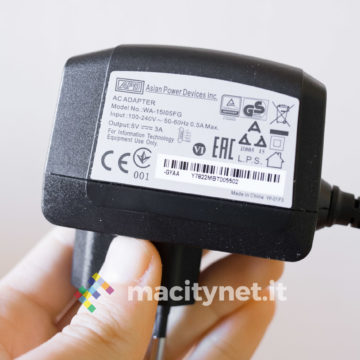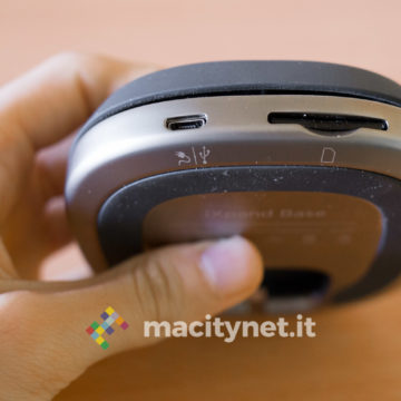 L’alimentazione avviene attraverso un caricatore incluso in confezione da 5V 3A, potenza necessaria per garantire la giusta quantità di corrente al dock per avviare il sistema di backup e ricaricare iPhone alla massima velocità (fino a 2A, dimezzando così i tempi di ricarica del caricatore originale da 1A). La presa microUSB è sul retro, al fianco dello slot SD all’interno del quale troviamo già inserita la scheda di memoria sulla quale saranno archiviati i dati, nel caso del nostro campione in prova con taglio da 32GB.
