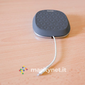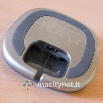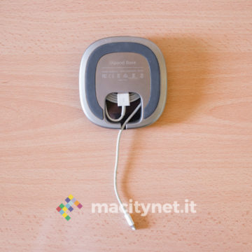 Queste due metà sono collegate tra loro da una piccola “colonna” centrale, che le tiene distanziate quel tanto che basta per permettere al cavo Lightning di essere attorcigliato e nascosto all’interno della base. La spina USB del cavo si infila nell’apposita presa sul fondo e in questo modo si potrà decidere di lasciar sporgere soltanto quei dieci centimetri di cavo restante sufficienti per garantire un agevole collegamento del telefono per la ricarica. Si tratta di una soluzione geniale che evita cavi penzolanti e rende il tutto molto più ordinato.