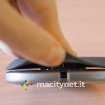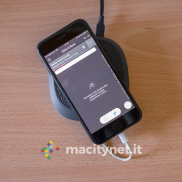La base è composta da due parti: la metà inferiore è in metallo satinato, molto pesante (complessivamente pesa poco più di 200 grammi) e perciò sufficientemente stabile quando la si appoggia sulla scrivania o sul comodino, specialmente per via dell’anello gommato sul fondo che ne migliora l’aderenza su superfici lisce. La metà superiore è invece in gomma, molto dura e con una trama in rilievo sulla superficie a contatto con lo smartphone, un’ottima scelta per evitare che il dorso liscio in alluminio possa scivolare visto che è leggermente inclinata (da un lato è spessa 2.5 centimetri, sul lato opposto 1.2 centimetri).