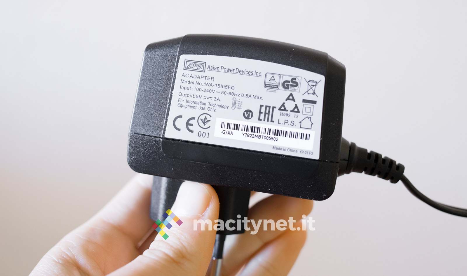 L’alimentazione avviene attraverso un caricatore incluso in confezione da 5V 3A, potenza necessaria per garantire la giusta quantità di corrente al dock per avviare il sistema di backup e ricaricare iPhone alla massima velocità (fino a 2A, dimezzando così i tempi di ricarica del caricatore originale da 1A). La presa microUSB è sul retro, al fianco dello slot SD all’interno del quale troviamo già inserita la scheda di memoria sulla quale saranno archiviati i dati, nel caso del nostro campione in prova con taglio da 32GB.