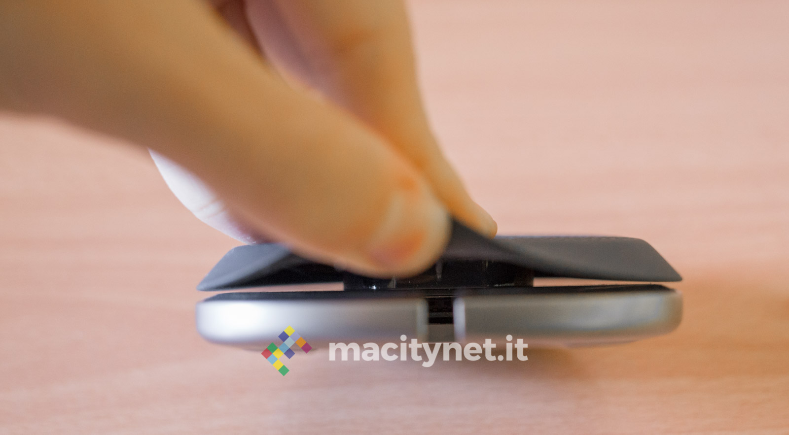 Queste due metà sono collegate tra loro da una piccola “colonna” centrale, che le tiene distanziate quel tanto che basta per permettere al cavo Lightning di essere attorcigliato e nascosto all’interno della base. La spina USB del cavo si infila nell’apposita presa sul fondo e in questo modo si potrà decidere di lasciar sporgere soltanto quei dieci centimetri di cavo restante sufficienti per garantire un agevole collegamento del telefono per la ricarica. Si tratta di una soluzione geniale che evita cavi penzolanti e rende il tutto molto più ordinato.