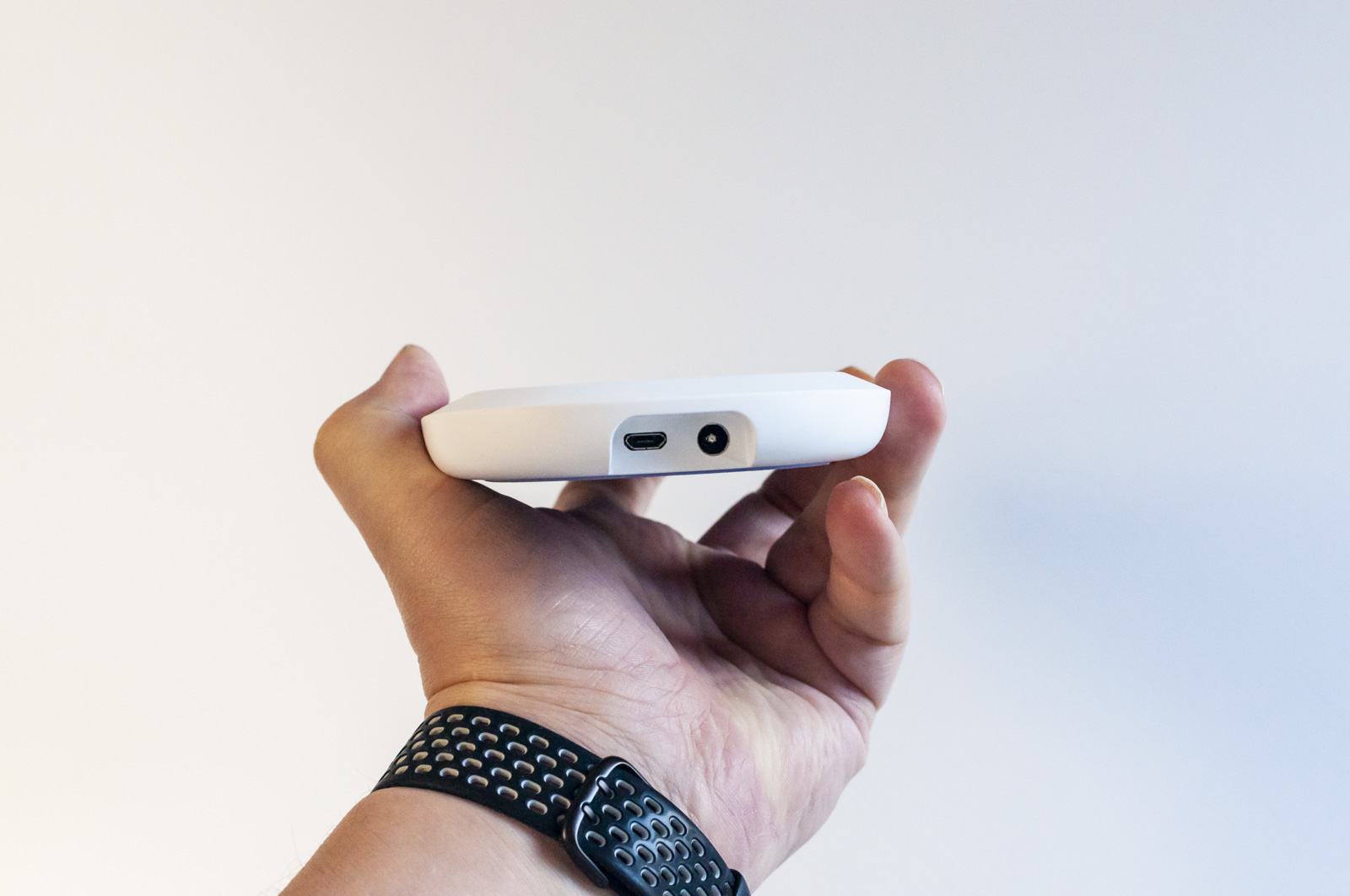 In uno dei lati corti trovano posto il connettore per l’alimentazione (con alimentatore esterno) e il connettore MicroUSB (ci aspettavamo una USB-C) per il collegamento ad un computer e il recupero dei dati in modo sicuro. In aggiunta a questo, nella parte inferiore trova posto un piccolo pulsante di reset, utile ad esempio se si cambia proprietario e abbinamento.