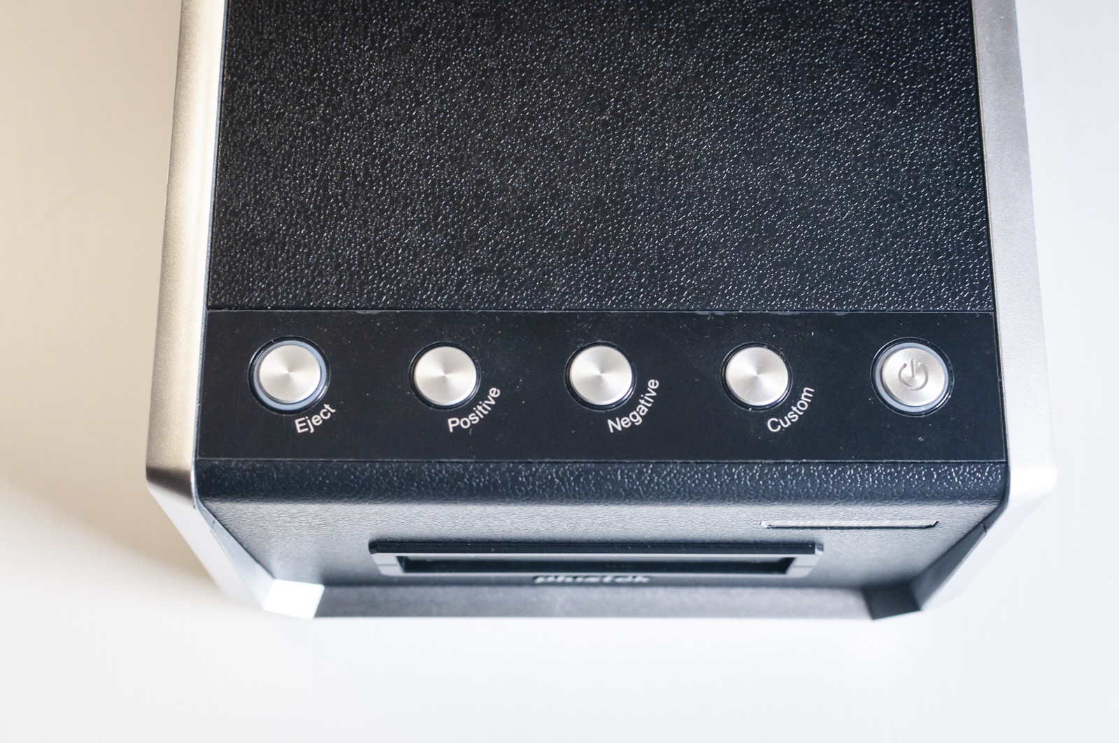 Plustek OpticFilm 135i è uno scanner a slitta con l’ingresso frontale per la slitta per le pellicole e cinque pulsanti superiori, mentre nella parte posteriore trovano posto i vari connettori USB per i dati e l’alimentazione, oltre ad una porta per l’uscita della slitta.