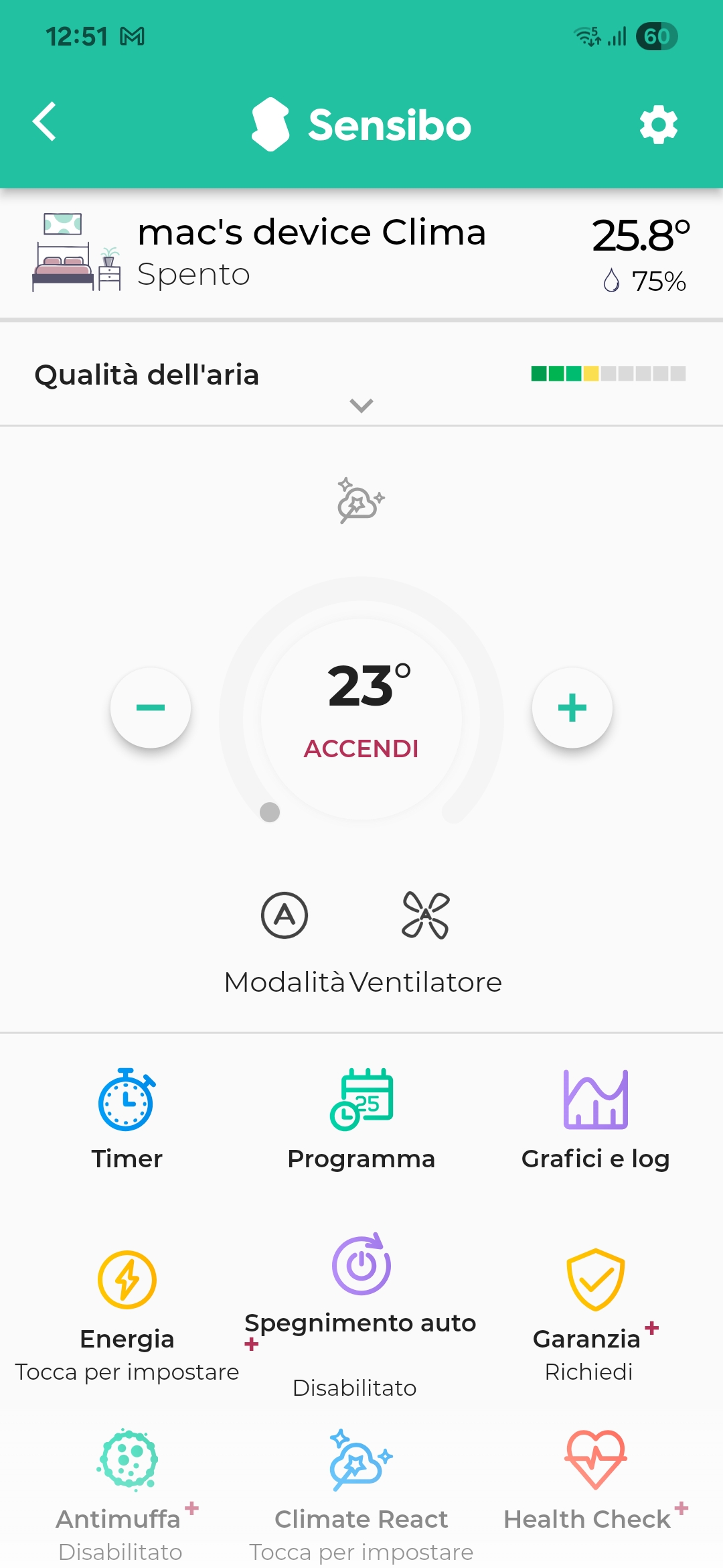 Non solo, mostra cronologie dettagliate dei dati ambientali e ciascuna opzione si trova davvero al posto giusto. Il menù iniziale è ricco di icone, che ben esplicitano il funzionamento. Tuttavia, quelle più avanzate – come l’automazione evoluta o il rilevamento delle finestre aperte – sono disponibili solo con l’abbonamento Sensibo Plus a 5,99 euro al mese o 2,91 euro al mese se si sottoscrive l’abbonamento annuale.
