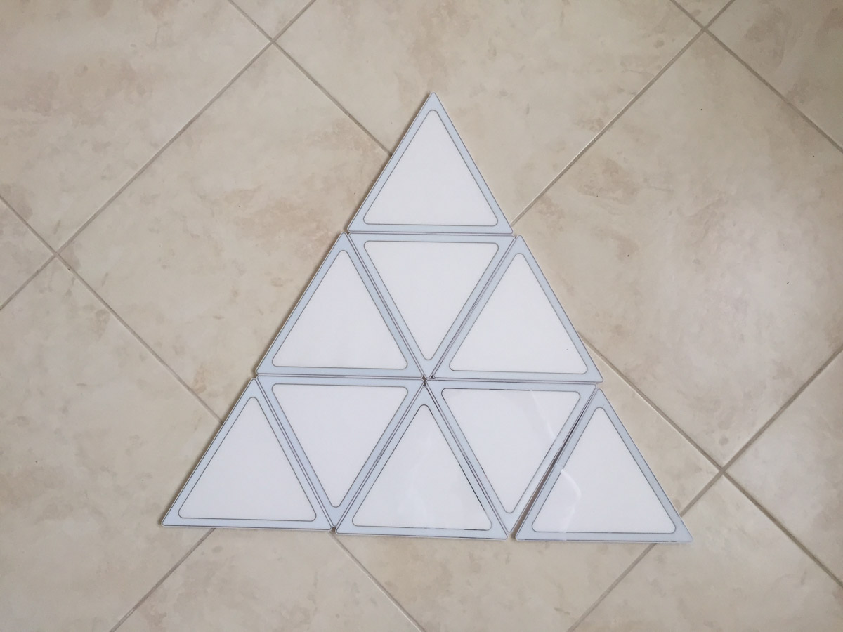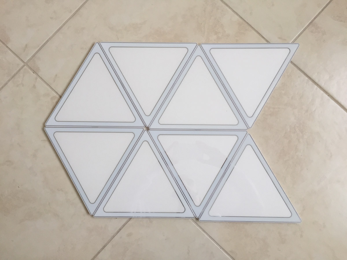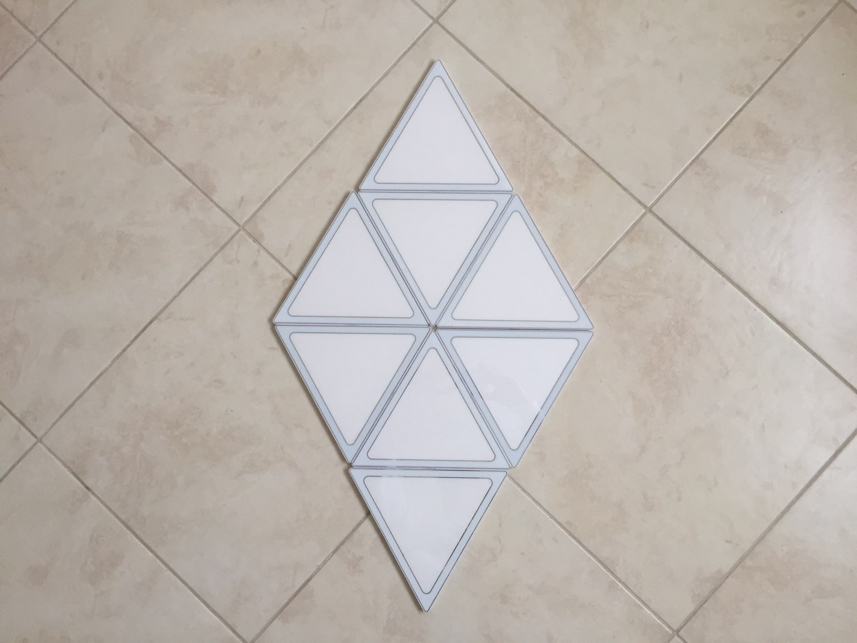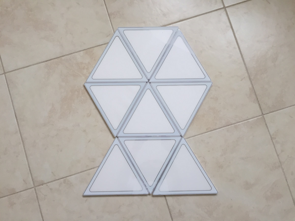 Questi connettori sono molto flessibili e il consiglio è quello di fare una prova delle varie combinazioni sul pavimento: sollevando due o più triangoli agganciati tra loro senza alcun sostegno si rischia di spezzare i chip, che sono quasi contati (11 chip per 9 pannelli LED). Meglio quindi provare prima il sistema a terra e poi fissare le lampade al muro o dove più si preferisce.