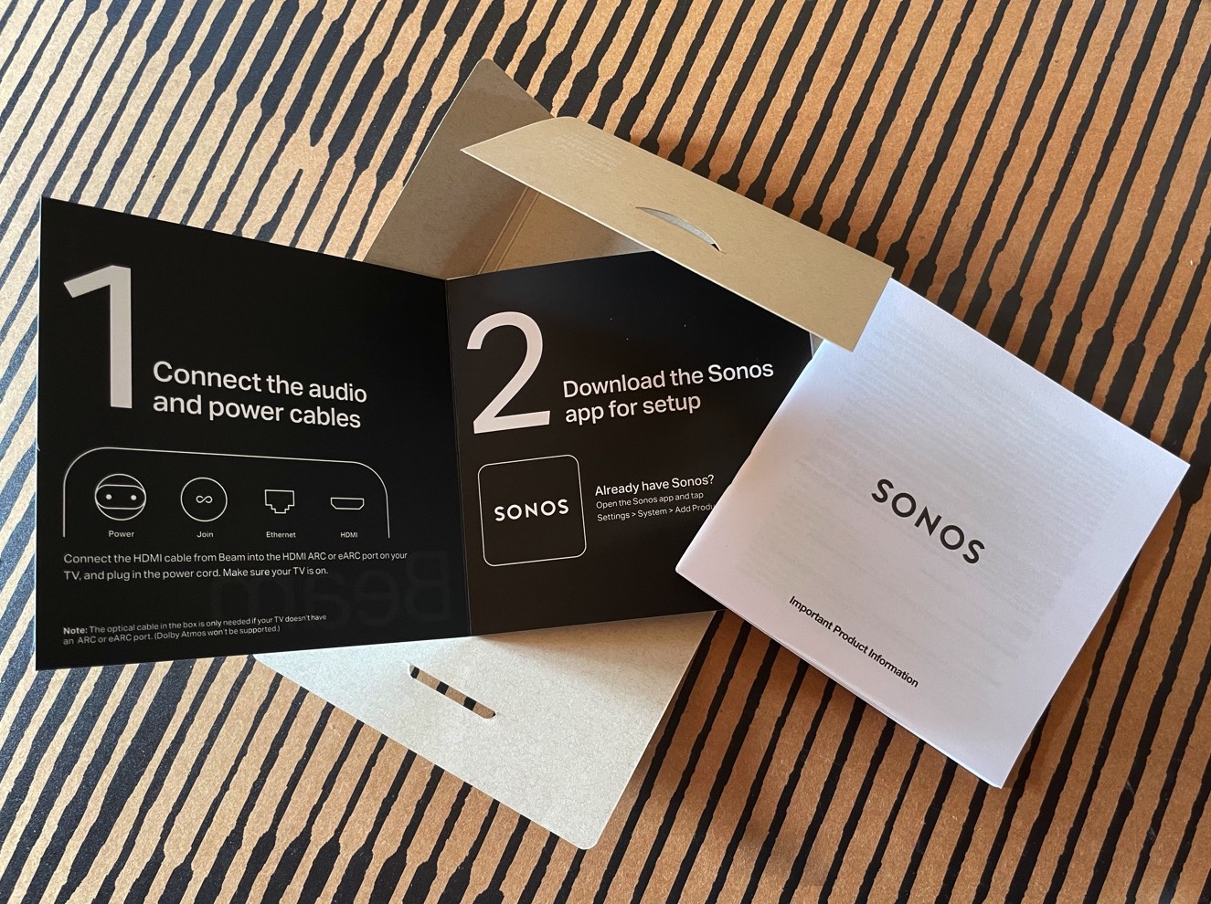 Nelle nuove confezioni di Sonos la plastica è ridotta al massimo e si fa gran uso di cartone tranne per il tessuto non tessuto che riveste la superificie di Beam. La scatola si apre sfilando la linguetta che apre longitudinalmente la lunga scatola della sound bar e dentro troviamo lo speaker che ricordavamo a memoria leggermente più piccolo, la scatola con dentro i cavi di rete, di alimentazione e HDMI (purtroppo questi insacchettati in plastica) e un’altra piccola scatola piatta dall’impronta quadrata con le garanzie ed uno stringato manuale operativo che rimanda al download dell’applicazione e all’uso dello smartphone per la configurazione.