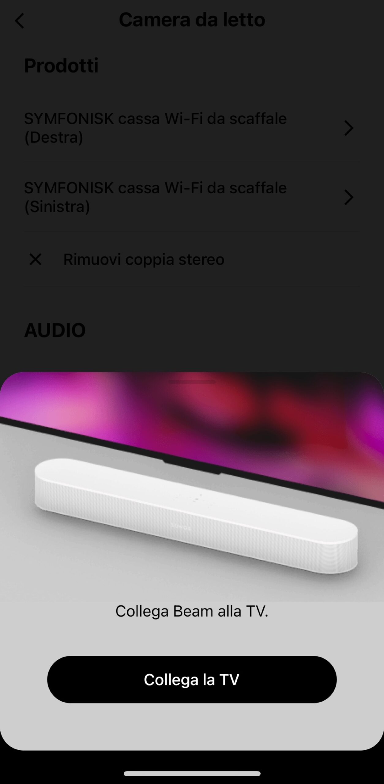 Sia che usiate Beam (Gen 2) in una postazione fissa sia che la trasformiate in un sistema di sonorizzazione Dolby Atmos mobile avete a disposizione uno strumento comodissimo per ottenere il meglio del suono nell’ambiente in cui vi trovate: il vostro iPhone. Un vantaggio rispetto all’utenza Android è l’opzione di calibrazione del suono che utilizza l’apparato microfonico di iPhone (e pure iPad) per rilevare la risposta della stanza rispetto ad un suono ad impulsi con variazione di frequenza che viene emesso o dalla soundbar o dal sistema surround Sonos. In meno di 3 minuti potete ottimizzare la riproduzione del suono anche se togliete o spostate un componente o spostate tutto il sistema in un altro ambiente magari con lo stesso accesso al Wi-Fi.