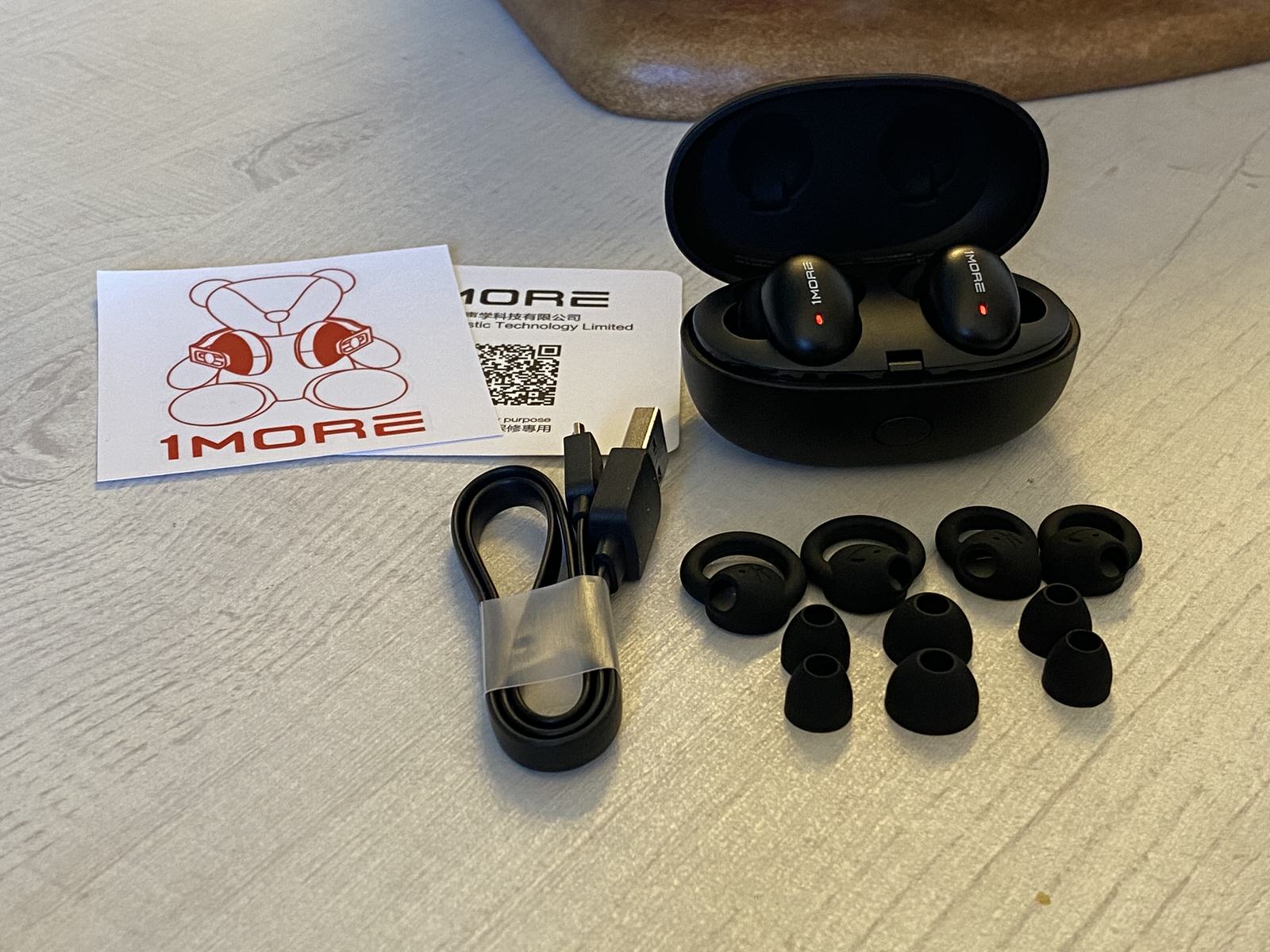 All’interno gli auricolari sono presentati in maniera accurata anche se c’è un po’ di eccesso di imballo (niente a che vedere con minimalismo di Apple). 1More non si è comunque risparmiata. Nella confezione si trovano oltre agli auricolari e alla custodia di ricarica anche 4 set di inserti in gomma per il cavo dell’orecchio, tre anelli per tenere in posizione gli auricolari fermi mentre li si utilizza e una piccola borsetta per custodire… la custodia.