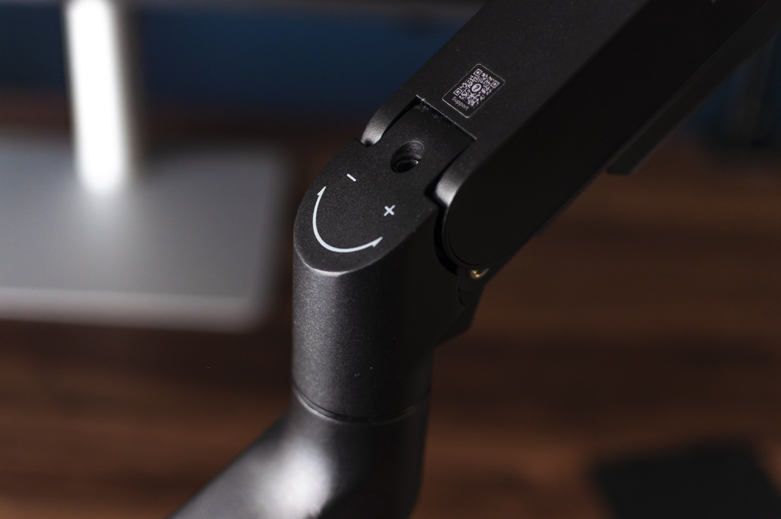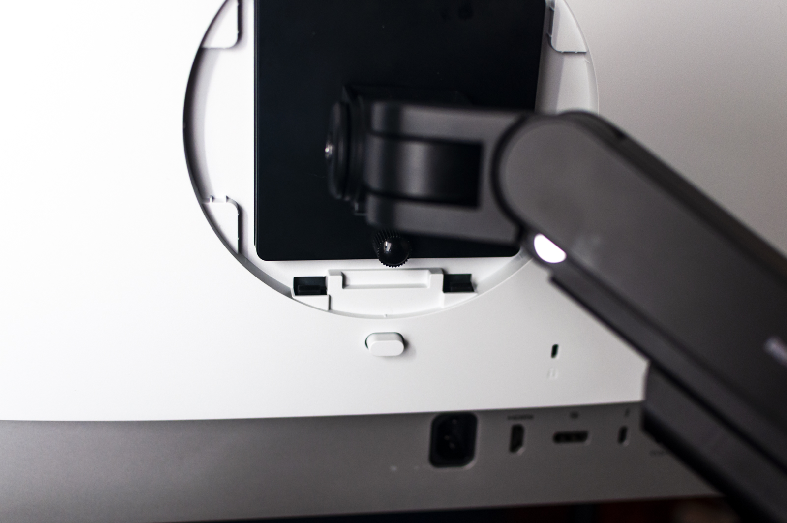 Nella parte superiore del braccio sosta una ansa passacavi utile per portare un cavo energetico ma anche per un cavo dati del tipo USB-C o Thunderbolt, in modo da alzare il range del cavo per non dare fastidio alla parte sotto il monitor, dove possono sostare altri oggetti (come ad esempio una webcam).