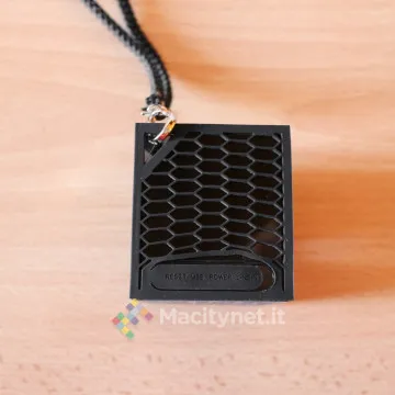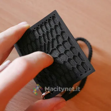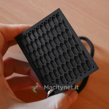 Togliamoci il dente evidenziando subito quello che secondo noi è il difetto più grande e che va a sfumare l’idea di quello che potrebbe essere l’altoparlante tascabile perfetto per molti: il rivestimento in gomma. Tanto particolare (non ne abbiamo mai visto uno simile in un altro speaker prima d’ora) quanto potenzialmente problematico, è caratterizzato da una rete a maglie larghe con trama esagonale che avvolge tutti i lati del piccolo parallelepipedo, eccezion fatta per la base, tutta ricoperta da una superficie in gomma completamente distaccata dal resto.