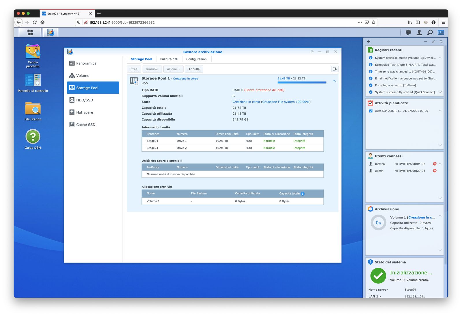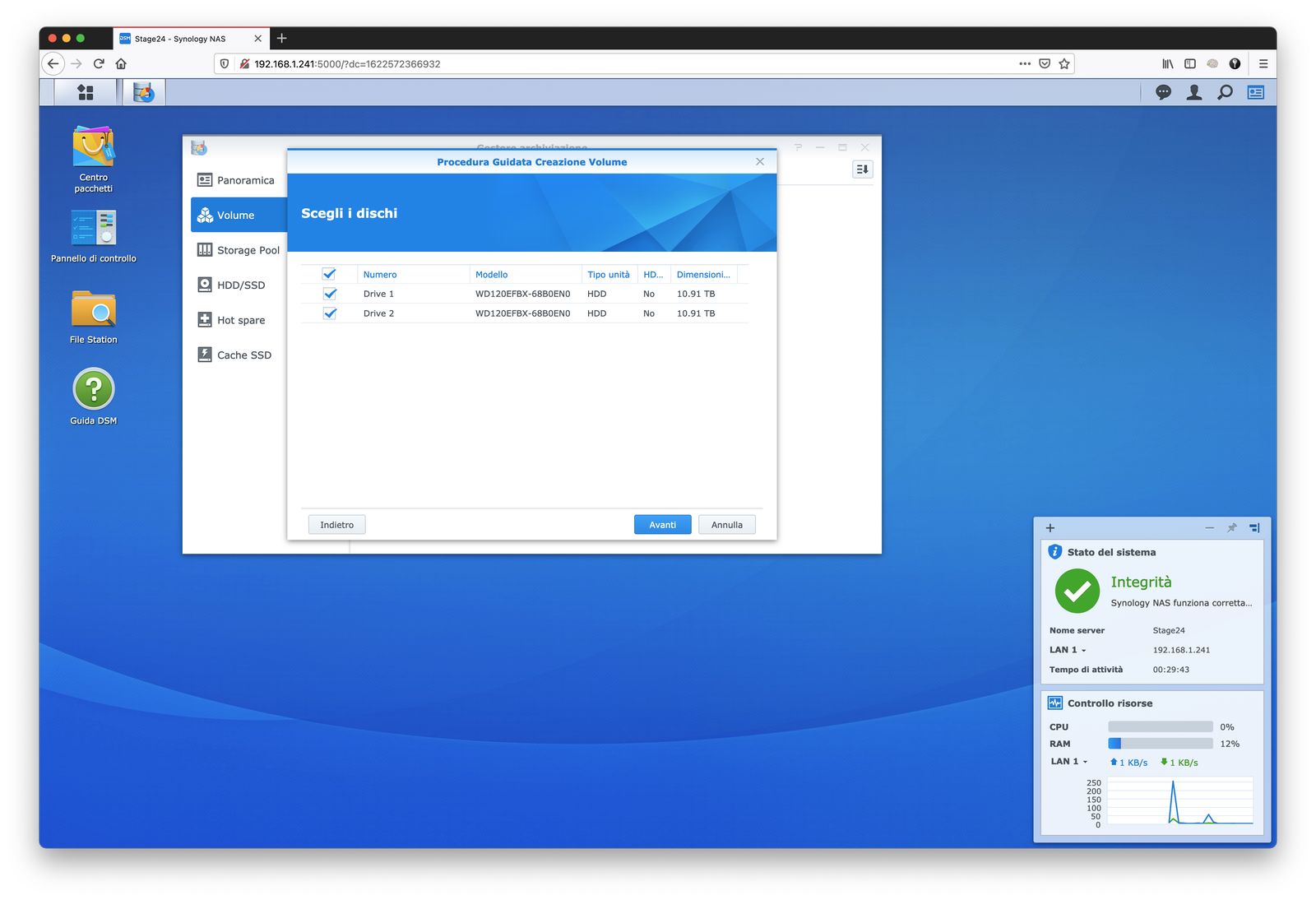 Una volta controllata la compatibilità dei dischi abbiamo optato per due unità meccaniche WD RED Plus da 12 TB, che abbiamo utilizzato in modalità RAID 0. La scelta del livello di RAID, un po’ inusuale in ottica professionale (dove di solito è preferito il livello RAID 1 su unità a due bay) è dato dal fatto che comunque è stato un periodo di prova e tutti i dati all’interno del volume da 21,4 TB così ottenuto erano comunque un backup di un altro archivio.