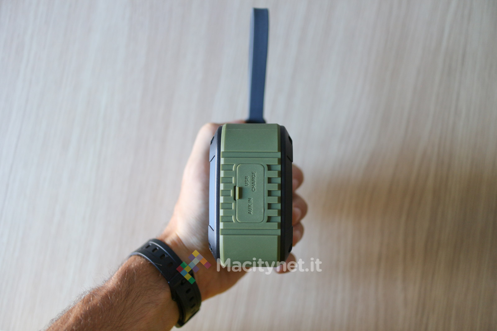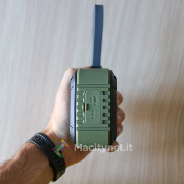 Pesa circa 280 grammi e misura 9,5 x 8,5 x 4,7 centimetri, non troppo grande se consideriamo che può essere fissato alla cintura dei pantaloni attraverso la maniglia in silicone incorporata. Tutta la cassa è in plastica rigida di buona qualità, circondata da uno strato in gomma di colore verde militare.