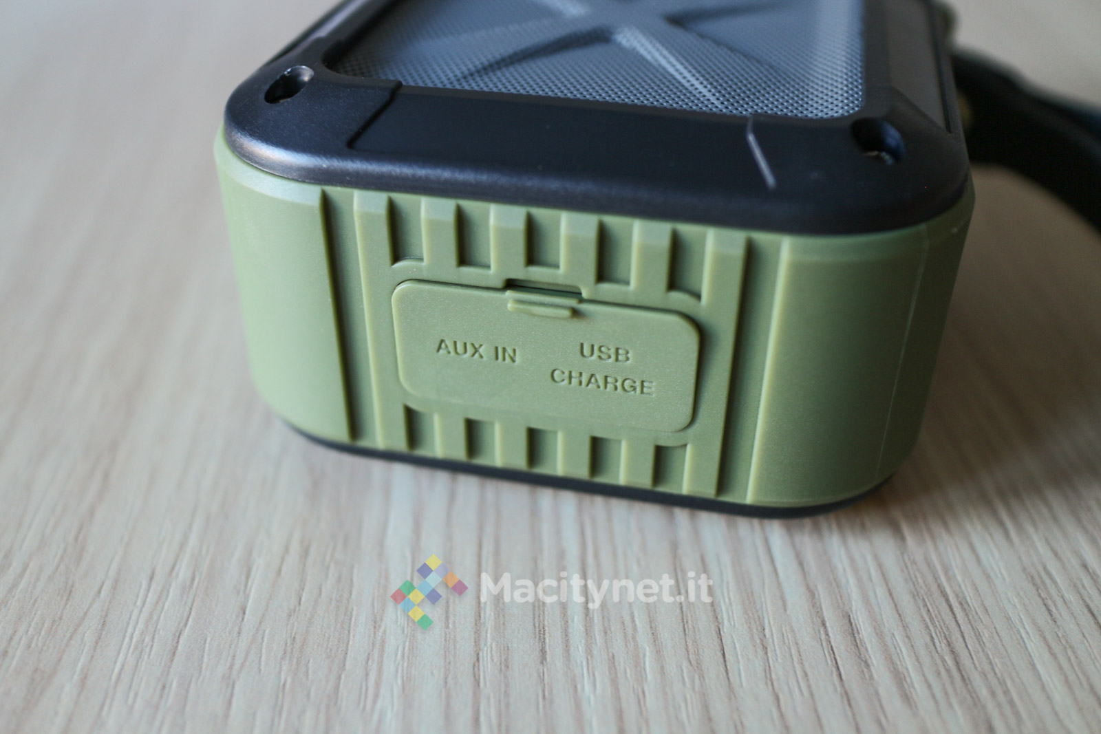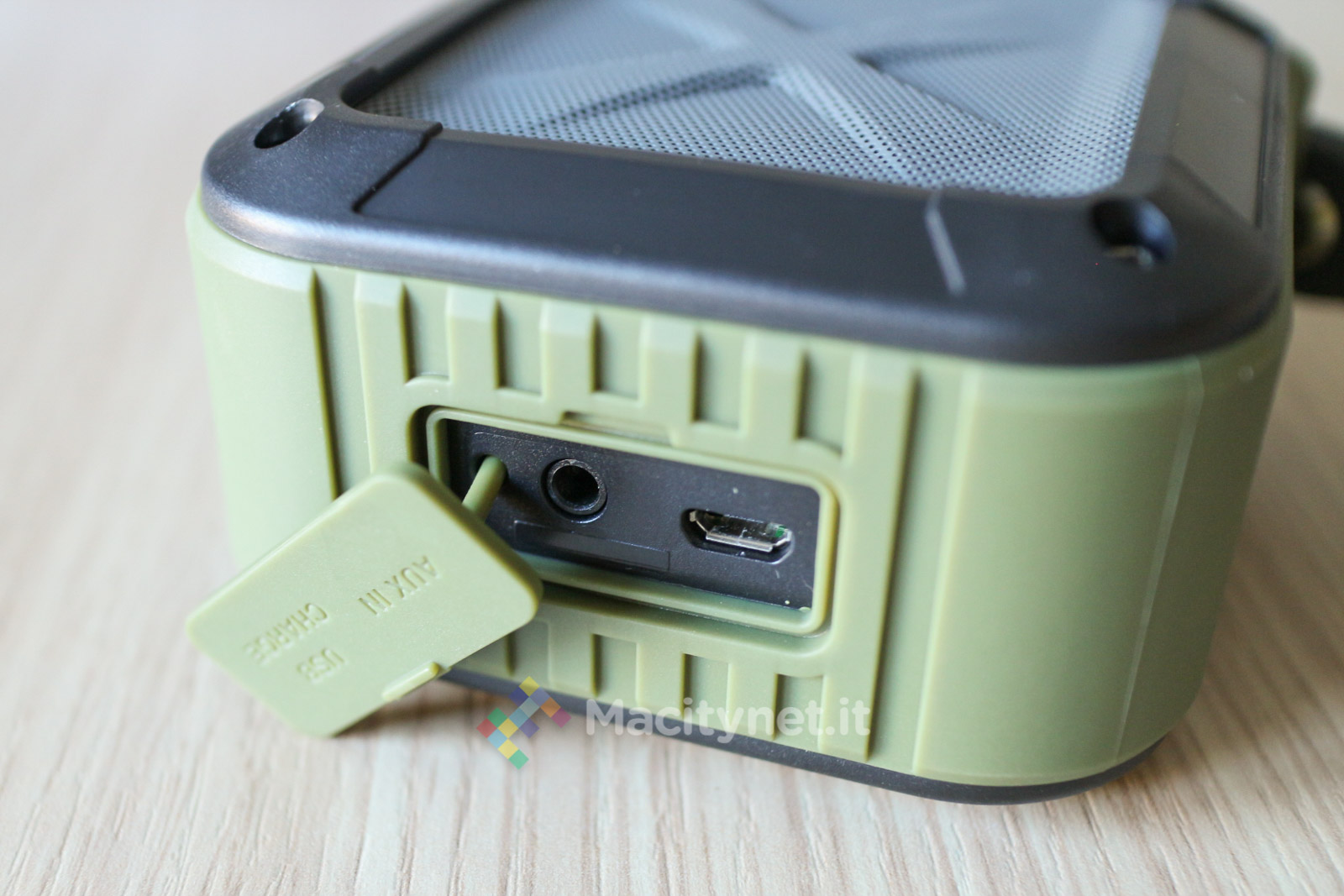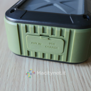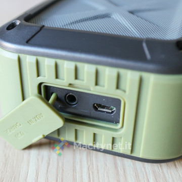 Da un lato troviamo i tasti Play/Pausa/Telefono, ON/OFF, + e – per il controllo di volume e tracce in riproduzione, da quello opposto una filettatura per la classica vite da 1/4, quindi compatibile con cavalletti ed altri supporti dove si potrebbe voler avvitare, in un terzo lato troviamo invece gli ingressi microUSB e aux opportunamente chiusi da un coperchio removibile che li protegge da polvere ed acqua.