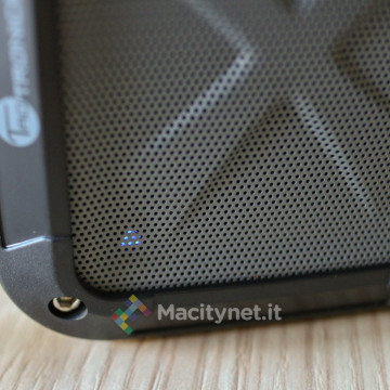 E’ certificato IPX5, quindi è a prova di schizzi, pioggia leggera, fango e polvere. Il driver da 3W è protetto da una copertura traforata in metallo che troviamo anche dal lato opposto, oltre la quale troviamo invece il subwoofer passivo che amplifica i bassi.
