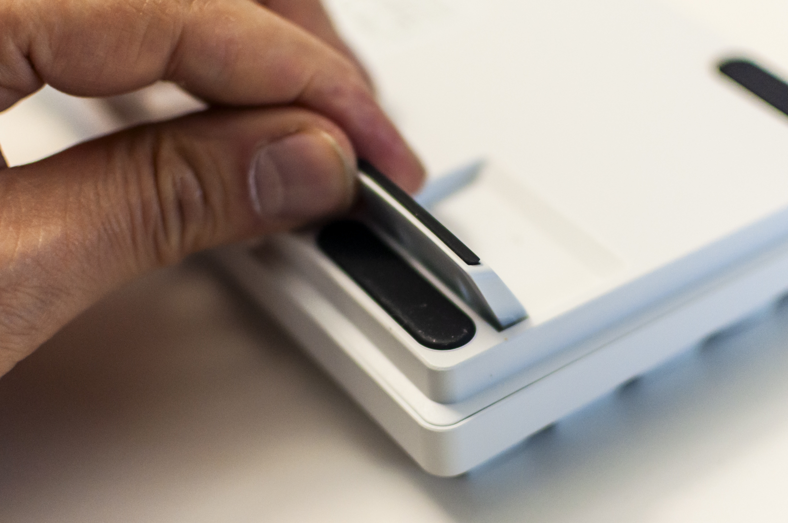 La base è di qualche millimetro più larga del letto dei tasti, con il connettore che sosta nella parte sinistra della tastiera: due piedini a doppia posizione permettono di scegliere la giusta inclinazione per operare, mentre altri due gommini viscosi aumentano la presa sul tavolo (o quello che è) per fermare la tastiera anche in caso di sollecitazioni dovute a momenti salienti del gioco.