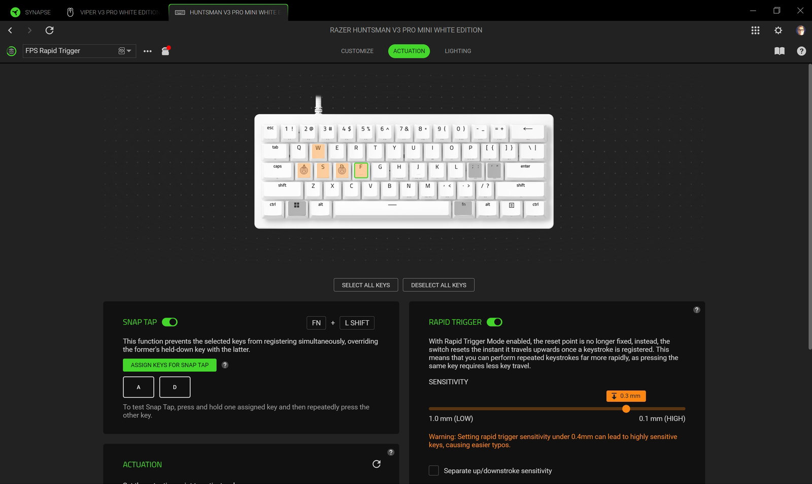 Inoltre, come in altre tastiere Razer, è possibile usare la nuova funzione Snap Tap, che permette di attivare funzioni diverse con due tasti senza per questo doverli rilasciare e riattivare entrambi (ottimo ad esempio per regolare dinamicamente il movimento di un personaggio nel gioco): la funzione è disattivata di default ma si attiva con un comando da tastiera, che illumina due tasti per avvisare l’utente.