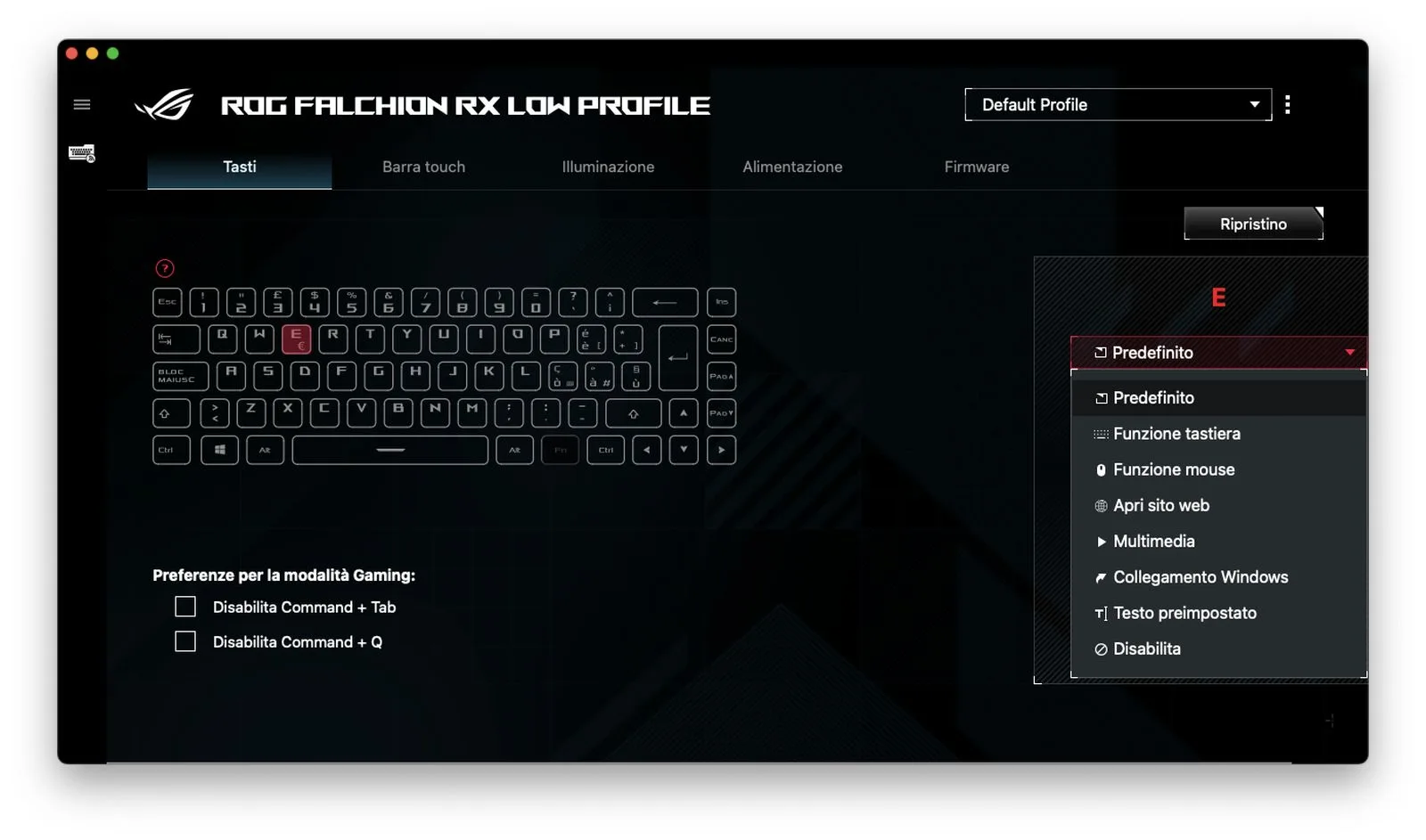 Se si fa un confronto sul mondo Pc, la possibilità di personalizzazione è in linea i concorrenti. Il pannello ha un tipico look da gamer con un un relativamente alto numero di personalizzazioni: si possono gestire tutti i tasti singolarmente, l’illuminazione RGB e anche il blocco di alcune combinazioni di tasti (come Commando o Control + Tab, che durante il gioco possono danno fastidio).