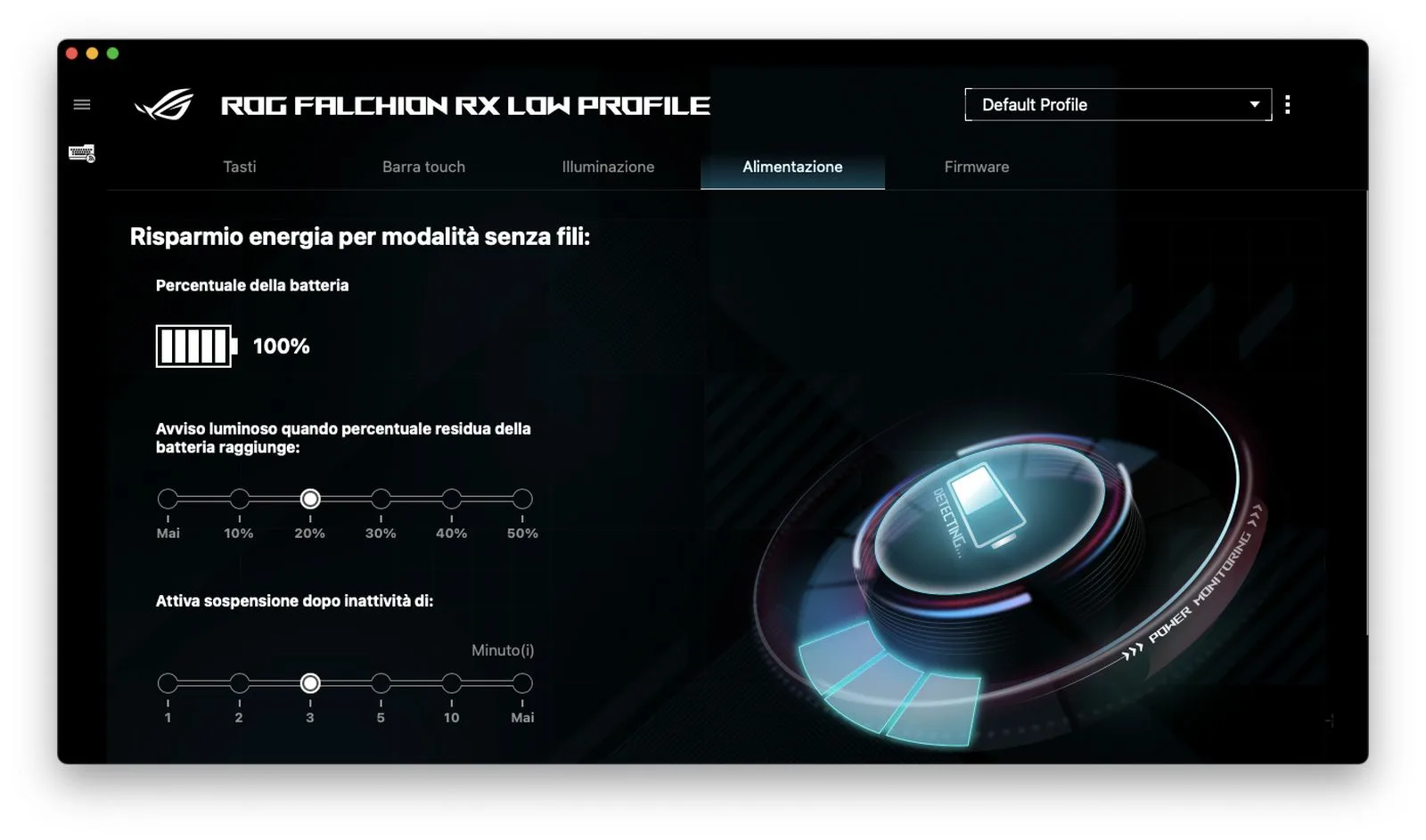 Quando la batteria arriva a fine corsa, la tastiera va in risparmio energia spegnendo le luci RGB (resta accesa solo la fascia superiore, illuminata di rosso) ma è possibile continuare ad usarla senza collegarla direttamente al computer. Basta connettere un alimentatore esterno. La tastiera così riattiva tutte le sue funzioni e nel contempo si ricarica.