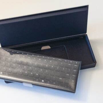 All’interno della scatola in cartone, ben serigrafata all’esterno, trova posto la tastiera vera e propria, protetta da un sottile velo di plastica trasparente, con appena sotto il cavo di ricarica USB-C/USB-C e un piccolo manuale di istruzioni.