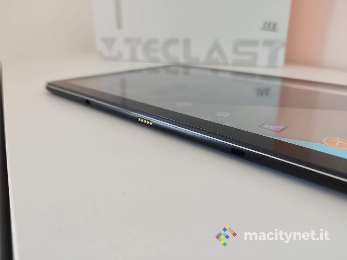 Ancora, sul fondo è presente un connettore magnetico, che serve per poter collegare la cover tastiera, che non è inclusa in confezione, ma che sinceramente vi consigliamo di acquistare in separata sede, per poter trasformare il tablet in una periferica da lavoro, simile per quanto possibile ad un notebook, naturalmente con l’ecosistema Android a bordo.