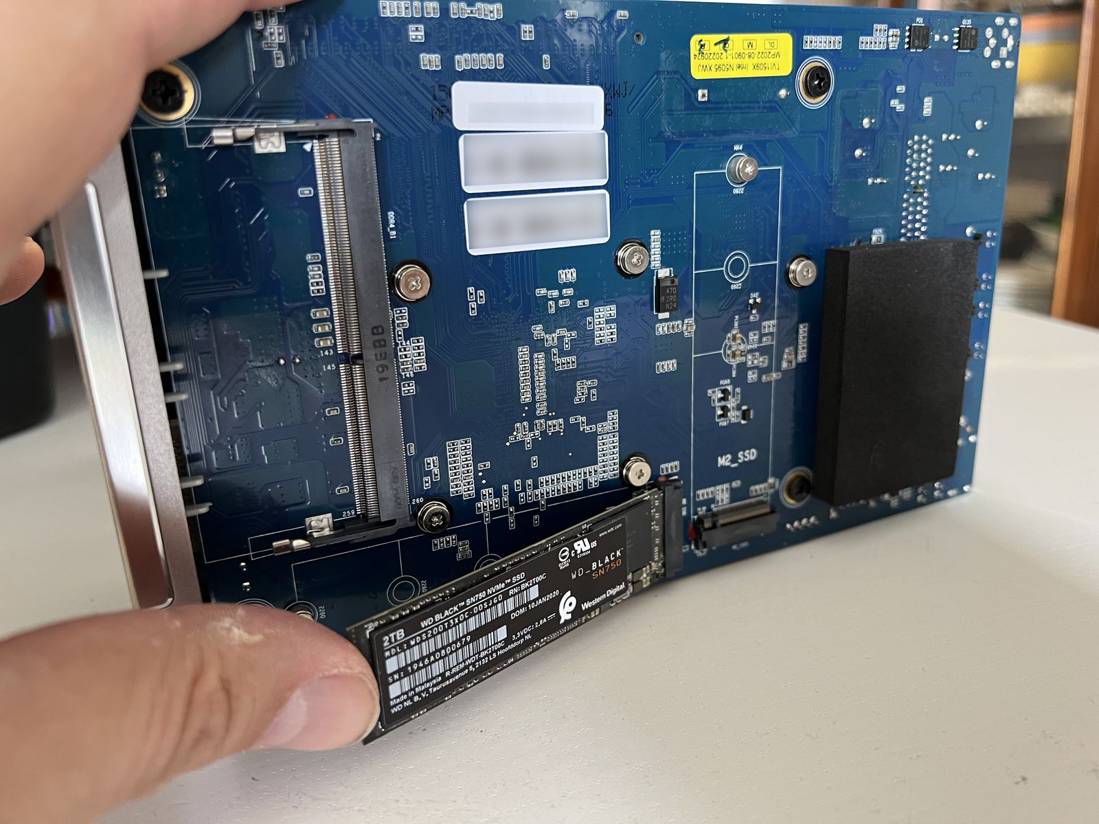 Discorso diverso per quanto riguarda l’installazione delle unità M.2, novità di questa versione: per farlo serve smontare il case esterno del TerraMaster F4-423 con un cacciavite a stella, per accedere poi ai due slot disponibili, posizionati a fianco del modulo RAM aggiuntivo.