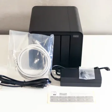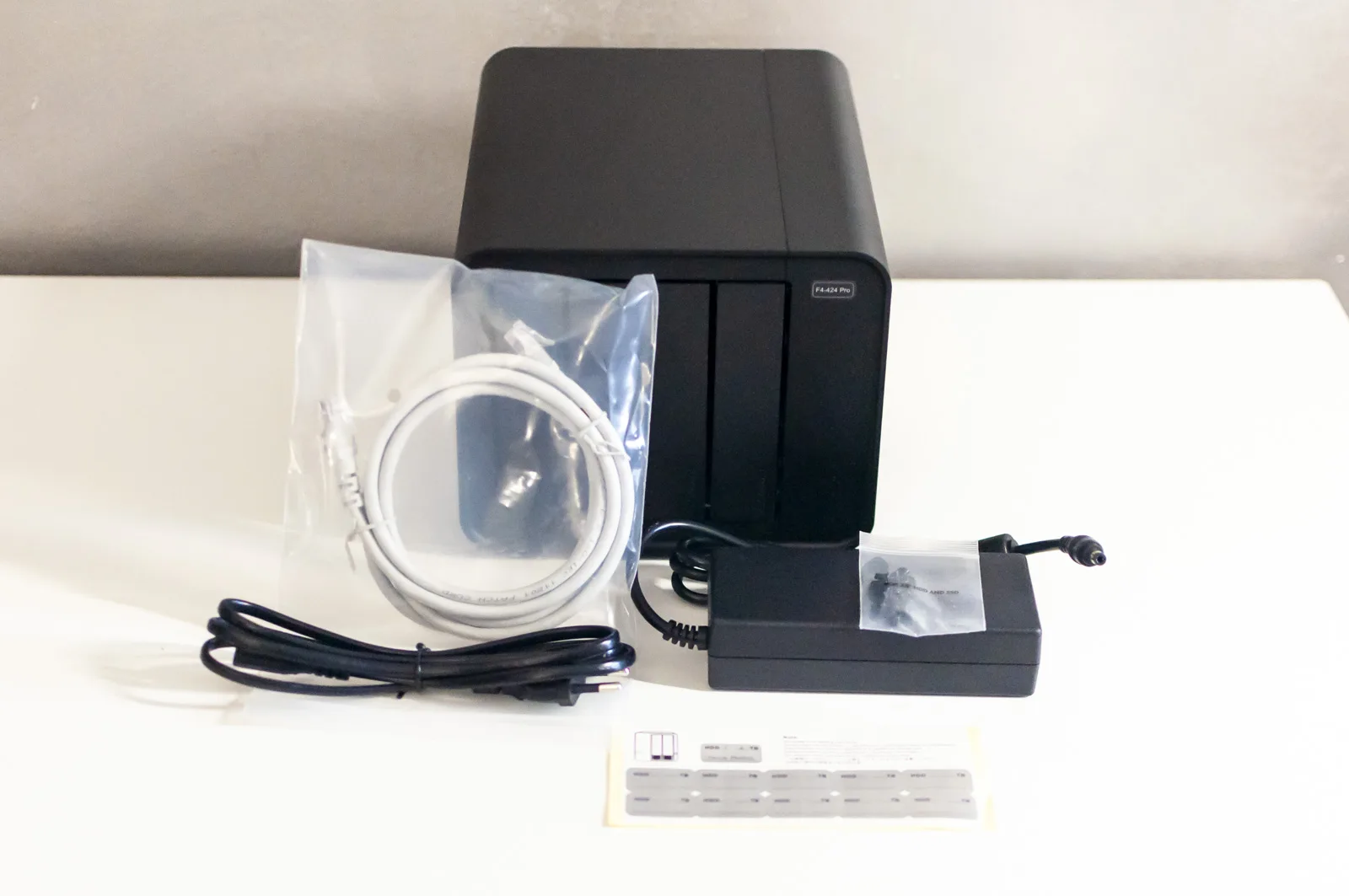 All’interno della scatola troviamo il NAS vero e proprio, l’alimentatore esterno, una piccola busta per le viti (utili come vedremo solo per le unità da 2,5”), un cavo Ethernet e un utile (ma già visto negli altri NAS TerraMaster) adesivo da porre frontalmente alle slitte per identificare i dischi.