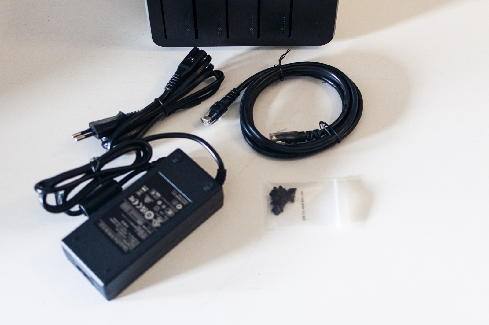 Nel pacchetto troviamo l’alimentatore esterno, il cavo di ricarica, un cavo Ethernet e le viti necessarie per le unità SSD SATA da 2,5”, sempre meno rilevanti sul mercato, dato il calo dei prezzi dei modelli M.2.