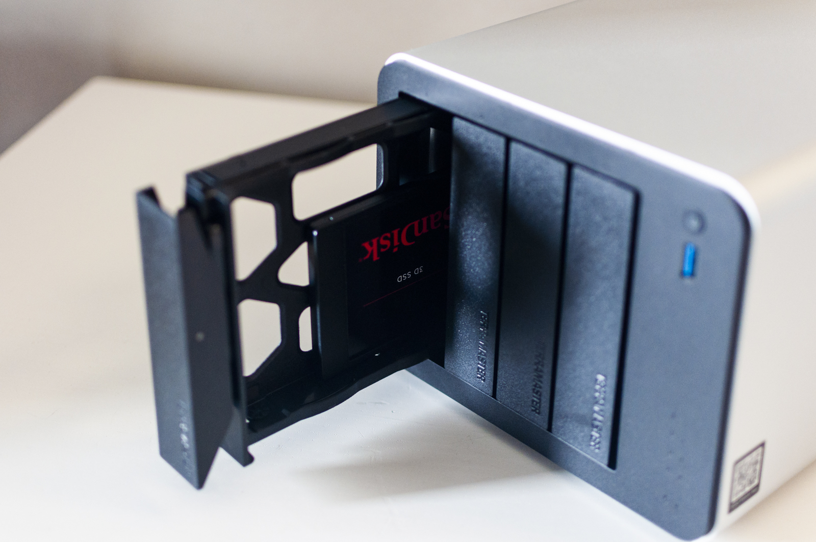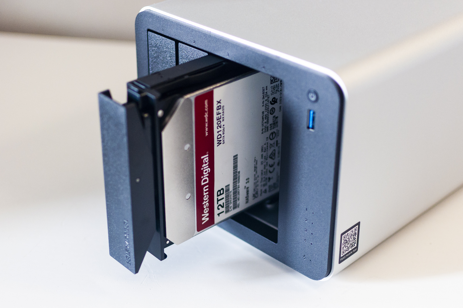 La parte frontale in plastica nera ospita i 4 slot per dischi SATA (meccanici o SSD) con il logo inciso nella parte bassa. I dischi meccanici si montano senza viti, grazie a un sistema a gancio sulle slitte, sempre più diffuso anche in ambito professionale.