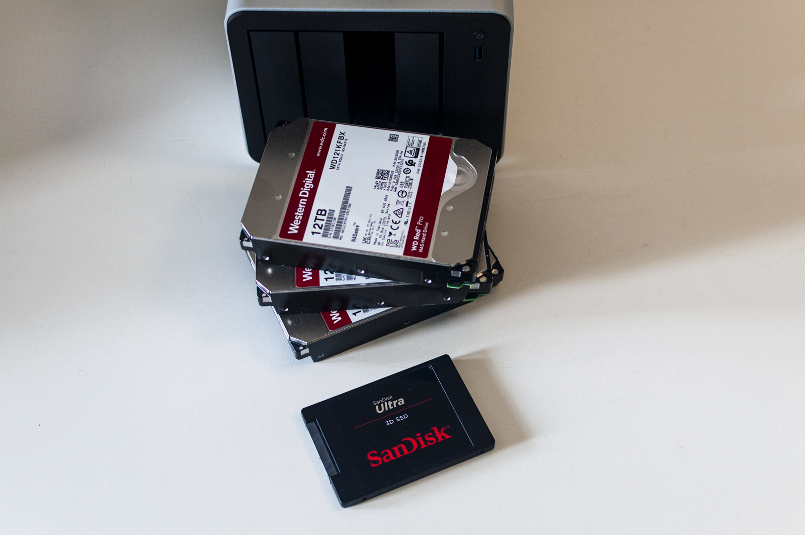 Abbiamo configurato il TerraMaster F4-425 con tre dischi da 12 TB WD Red Pro in RAID 0, una SSD SanDisk Plus come disco singolo e una SSD M.2 Orico come cache del volume RAID.