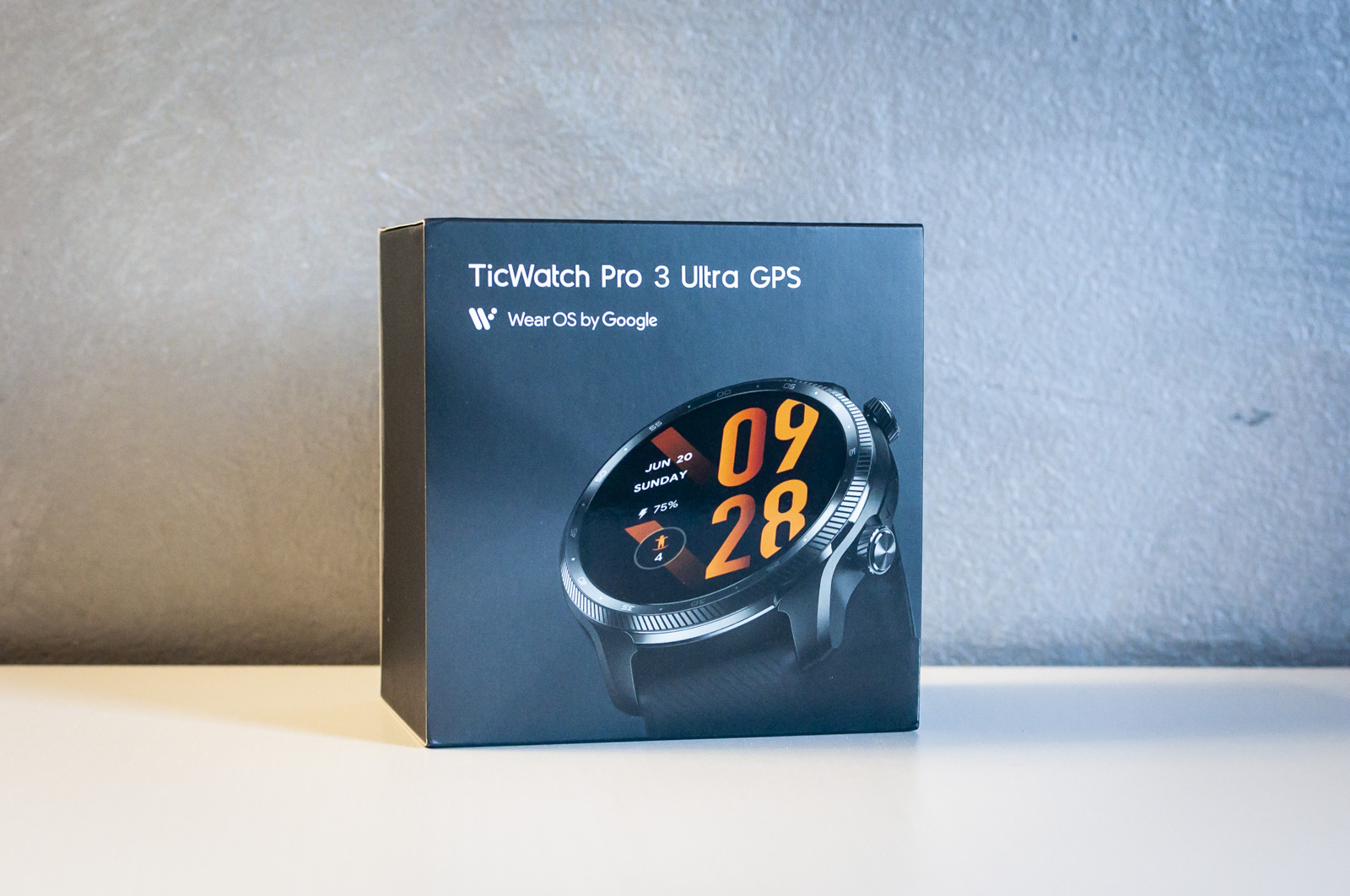 TicWatch Pro 3 Ultra GPS arriva in una piccola scatola di cartone che mostra nella grafica quello che è l’aspetto del prodotto con la sua “face” di riferimento.