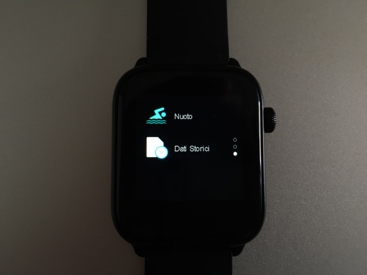 Spostiamo l’attenzione sull’aspetto estetico: è molto piccolino, leggero, dalle curve dolci ed eleganti. In effetti un po’ all’Apple Watch ci somiglia. Ha persino una replica in miniatura della corona digitale, solo che qui ha la sola funzione di pulsante multifunzione: ruota, in effetti, anche con una certa resistenza, ma non è associato ad alcuna funzione. Un vero peccato, anche perché lo schermino è piccolo e con il dito in qualche sezione delle app si fa fatica a muoversi.