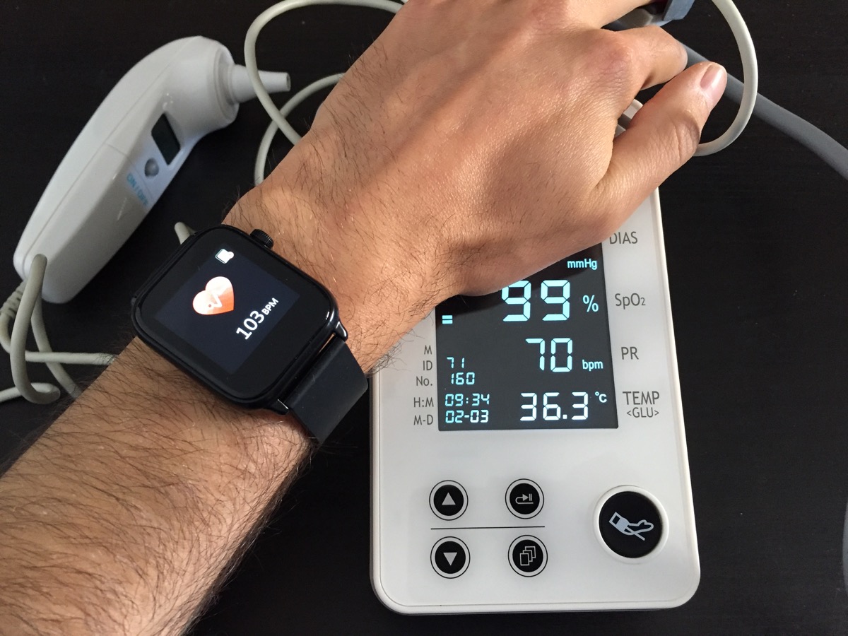 Per capire se davvero le misurazioni che propone sono valide abbiamo confrontato i valori rilevati dallo smartwatch con quelli ottenuti attraverso uno strumento professionale, un dispositivo medico piuttosto affidabile il cui prezzo è di centinaia di euro, quindi ben al di sopra del costo di questo smartwatch. Abbiamo eseguito le singole misurazioni, contemporaneamente, da entrambi i dispositivi, in modo tale da avere a disposizione un valido confronto su cui basare poi quanto state per leggere.