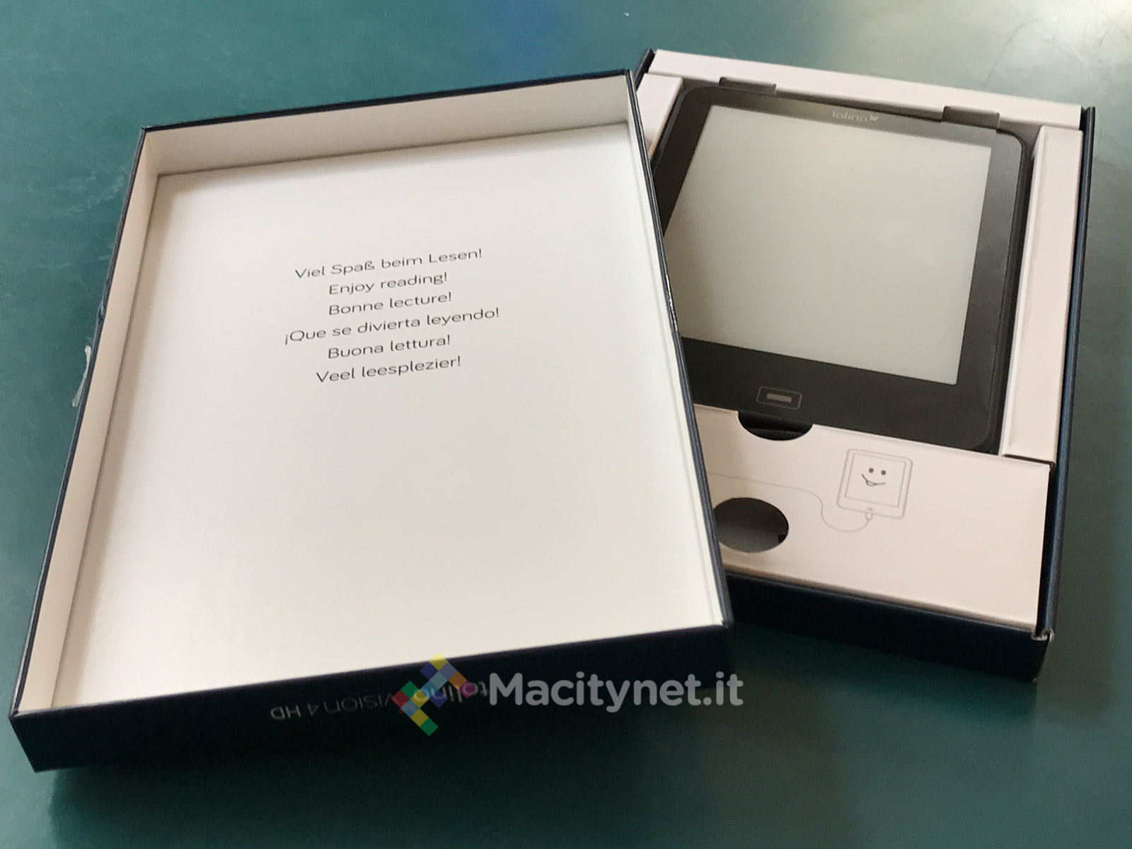 L’esperienza di lettura con Tolino è stata fin da subito piacevole. L’apparecchio è studiato non solo nella parte hardware – cosa che qualsiasi buon terzista cinese sarebbe in grado di fare e in effetti fa – ma anche nel software. L’interfaccia è razionale ed efficiente, il “sorriso” dell’apparecchio è invitante, e la dotazione (cavetto Usb A-micro e manualetto) è spartanza ma ben fatta. Stilosa, verrebbe da dire.