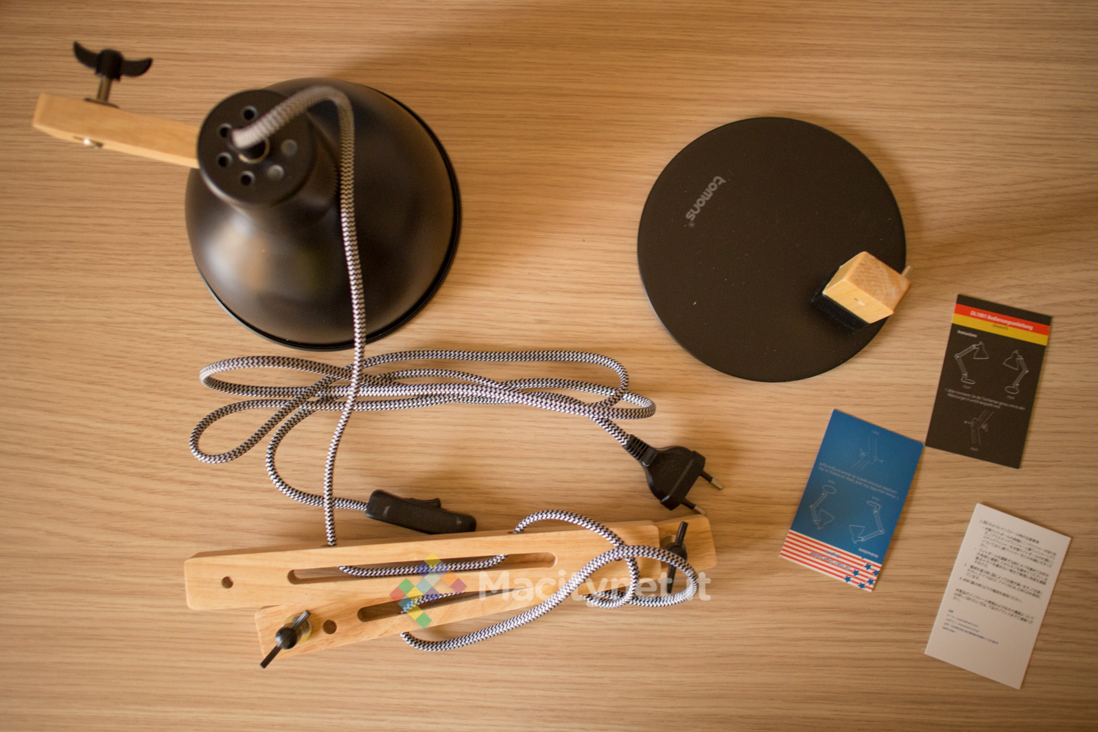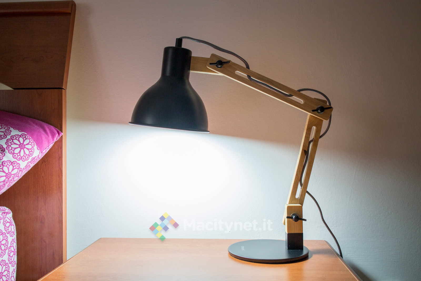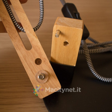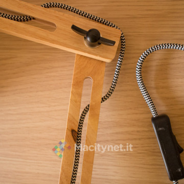 Completata la fase di montaggio, è possibile collegare la lampada alla presa di corrente attraverso la spina (italiana) e gestire accensione e spegnimento attraverso l’interruttore incorporato lungo il cavo. Di base il cavo, che passa attraverso ciascuna componente del braccio in legno, è allentato quanto basta per permettere qualsiasi tipo di orientamento della lampada, potendola così orientare e ripiegare facilmente. Con un po’ di pazienza, è possibile tenderlo per farlo aderire quanto più possibile alla struttura, in questo modo risulterà visivamente più ordinata ma meno agile nei movimenti, anche se le torsioni e flessioni più comuni del braccio restano ancora del tutto agibili.