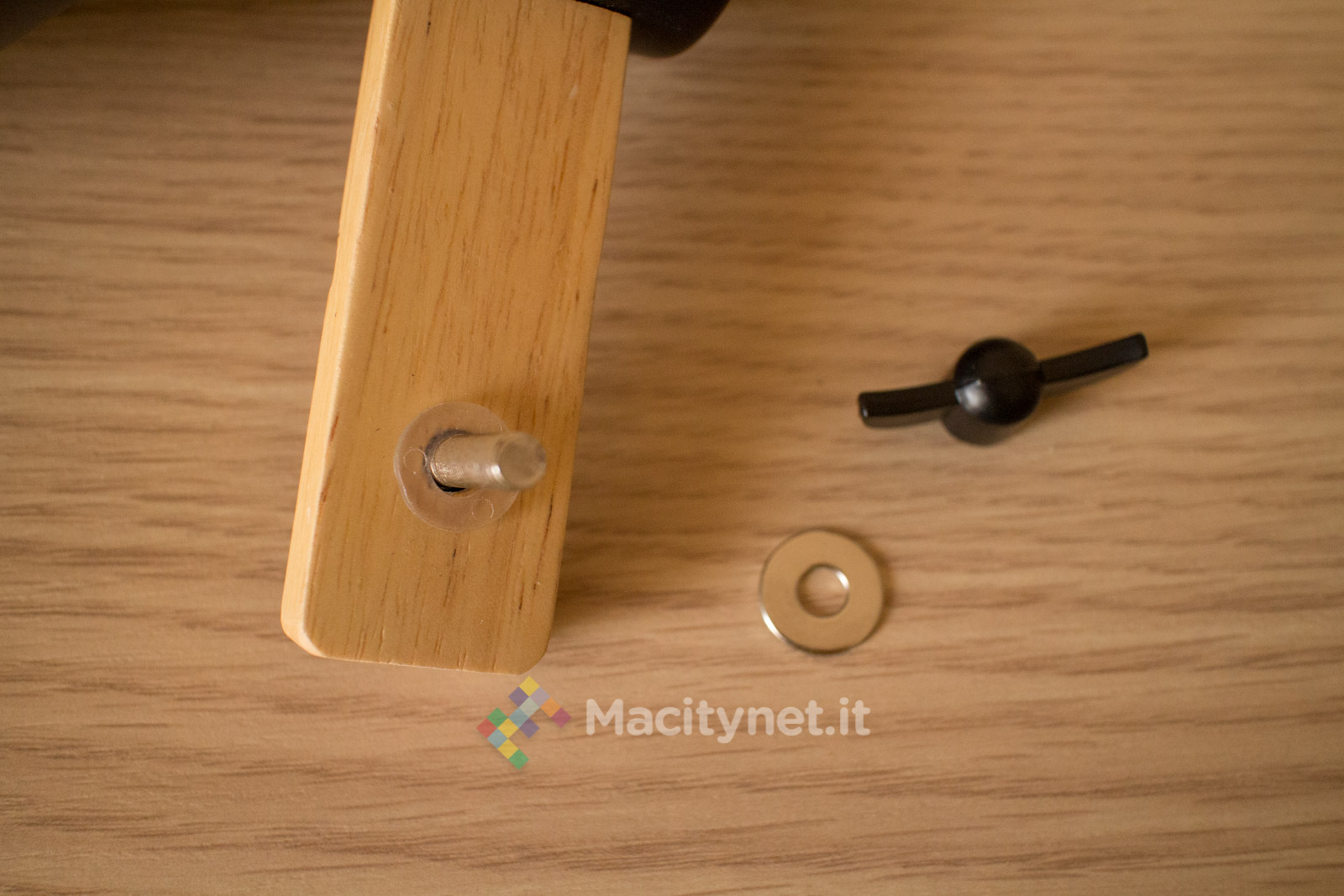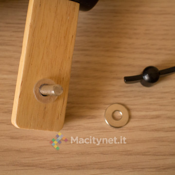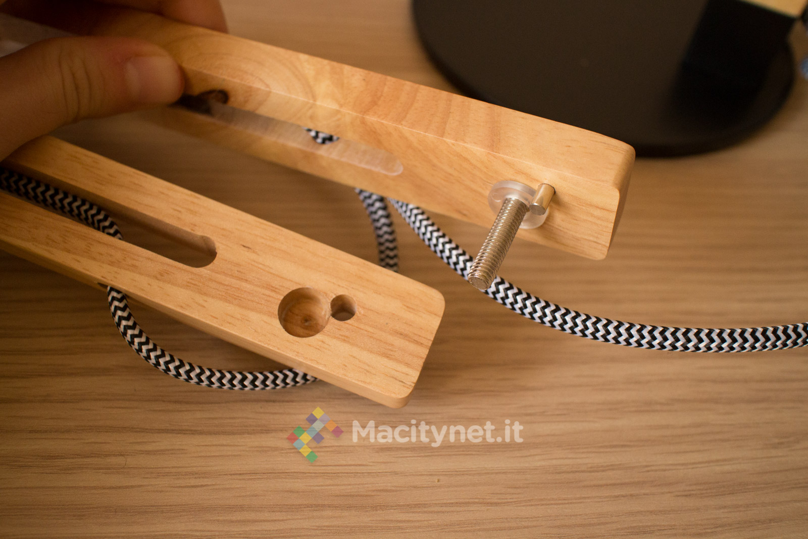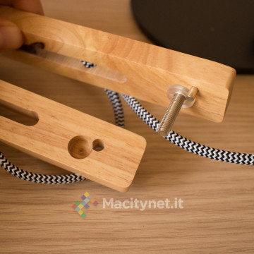 Le altre tre parti sono già “vicine” tra loro in quanto bloccate dal cavo della lampada. E’ spesso mezzo centimetro ed è molto robusto per via della resistente guaina in nylon intrecciato che lo riveste completamente. Il montaggio è davvero intuitivo in quanto si tratta semplicemente di accostare in sequenza forni e perni di ciascuna parte, che sarà poi bloccata per mezzo della vite a farfalla posta su ciascuna estremità.