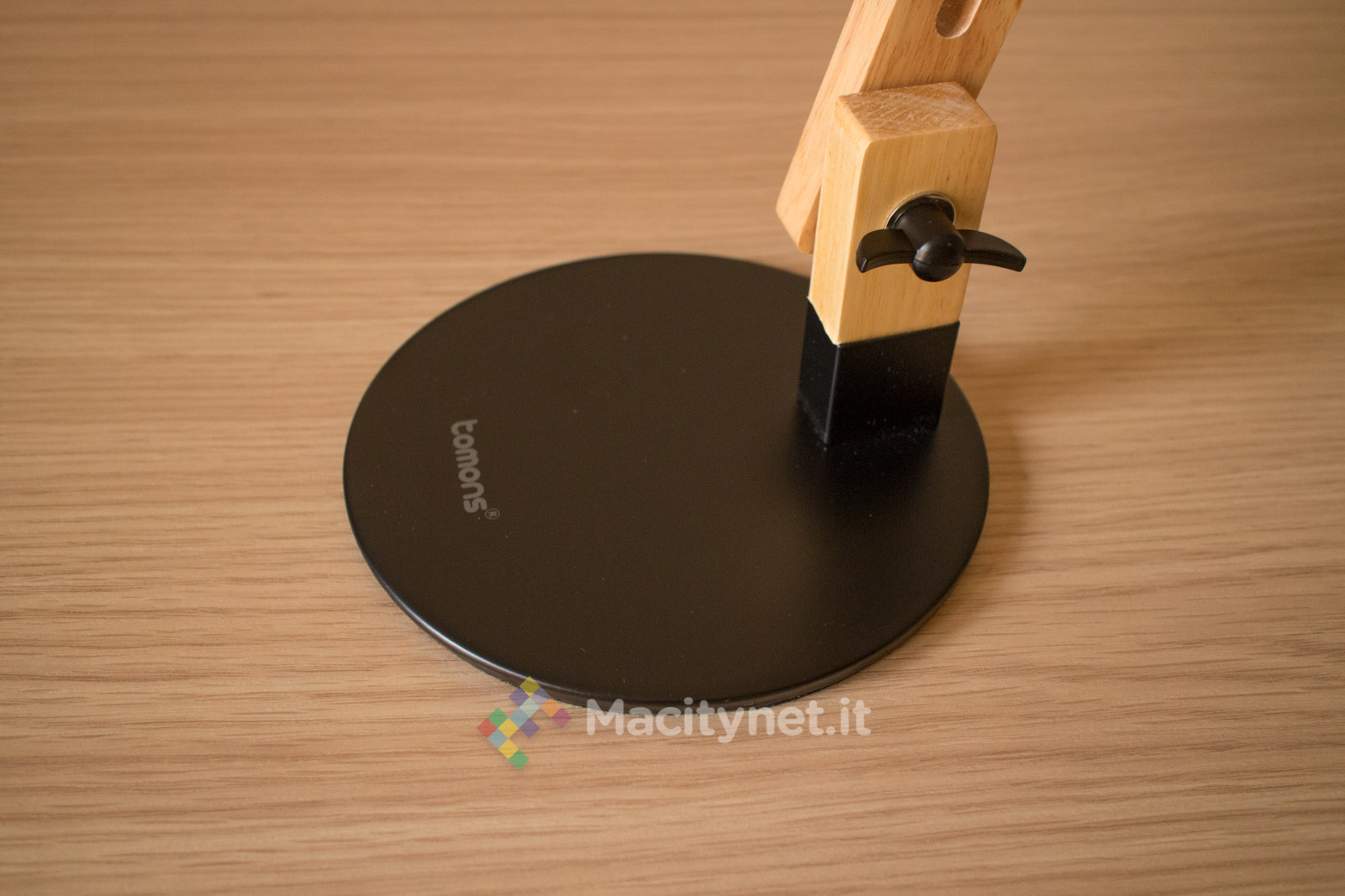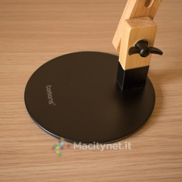 Una di queste è separata completamente dal resto. Si tratta della base, un’ampia lastra di metallo di sezione circolare con diametro 15 centimetri e spessa poco meno di un centimetro. E’ molto pesante, quasi un chilogrammo, e ciò garantisce un’ottima stabilità dell’intera struttura quando montata. E’ verniciata di nero (ma è in vendita anche nelle versioni bianco e verde), sulla base troviamo uno strato di feltro spesso pochi millimetri che migliora l’aderenza su una scrivania ed evita di rovinare la superficie di appoggio. Su un lato sporge la prima delle quattro parti che compongono il braccio pieghevole della lampada.