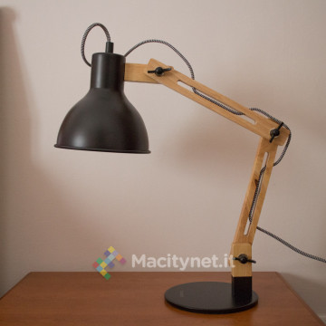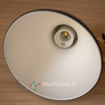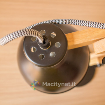 La parte terminale comprende l’ultimo componente in legno che si avvita al braccio ed il portalampada già infilato all’interno del paraluce (diametro 15 centimetri come la base), nera come la base all’esterno e bianca all’interno, per riflettere meglio la luce della lampadina (non inclusa).